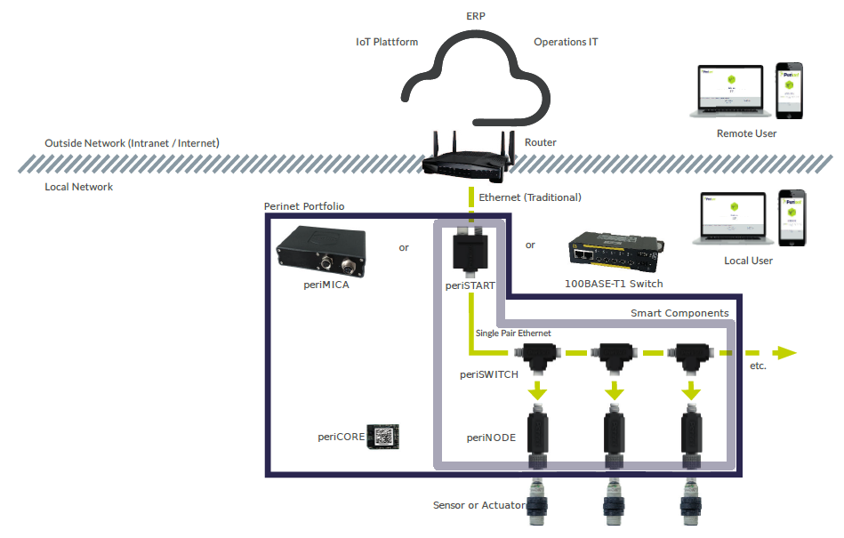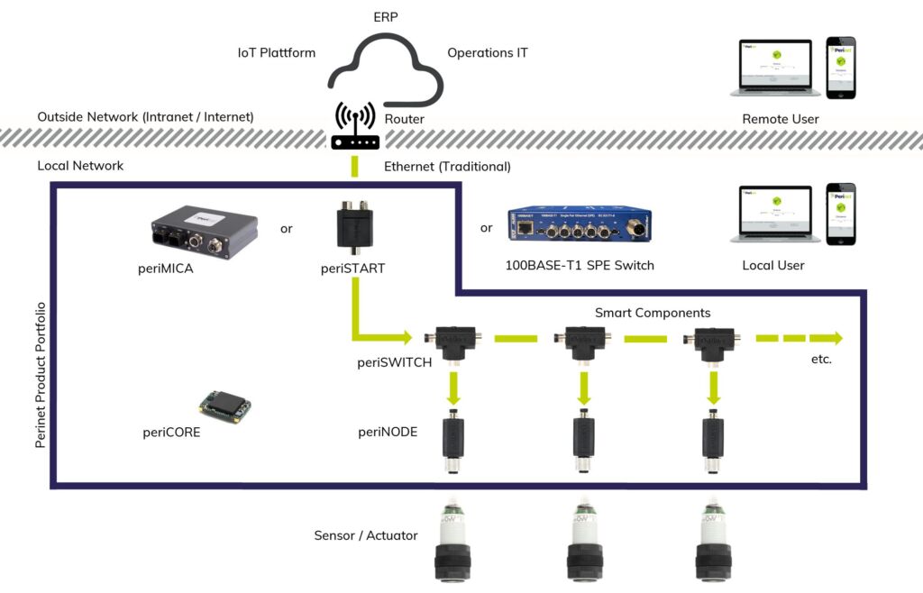 Alternativ zum Medienkonverter können auch Standard-100Base-T1-Router oder Switches oder ein leistungsfähiger modularer Perimica Edge Computer für die SPE-Anbindung genutzt werden. Mit dem Periswitch 3-port lässt sich eine Vielzahl von Modulen bzw. Sensoren ganz einfach mit einer einzigen seriellen SPE-Leitung verbinden, was die Installation in vielen Fällen deutlich vereinfacht (Point to Multi-Point, PtMP).