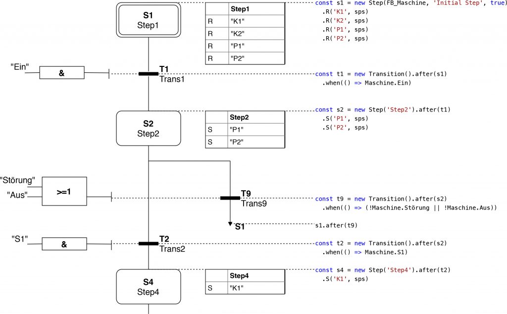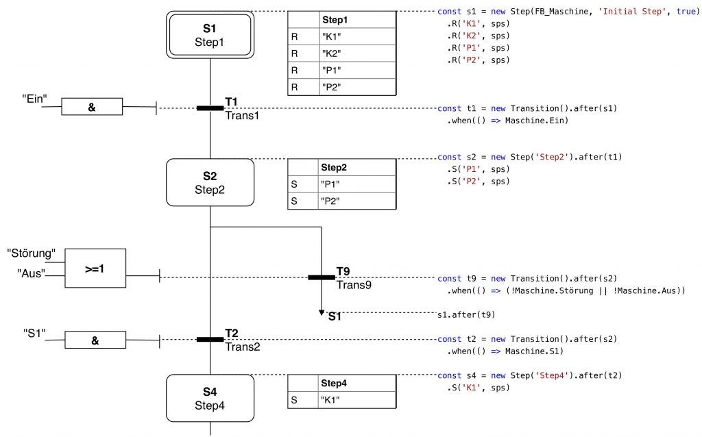 Ein Framework, welches alle diese Technologien nutzt und dabei einfach und überschaubar ist, ist NodeJSPS. Es ist ein Framework, das sich an Steuerungsentwickler und Automatisierungsingenieure richtet. Es bietet eine einfache Code Syntax zur Entwicklung von Ablaufplänen, die sich an die Syntax von Siemens-S7-Graph hält. Es wurde entwickelt, um einen leichten Einstieg in neue Technologien zu ermöglichen. NodeJSPS basiert auf NodeJS, einer Plattform für die Entwicklung von JavaScript (JS) basierten Backend-Systemen. JS gilt als einfach zu erlernende Skriptsprache. Der Code ist im Betrieb an der Maschine anpassbar und sofort ausführbar. Der Programmablauf in NodeJS ist ähnlich zum Ablauf einer SPS, garantiert jedoch keine Einhaltung von Echtzeit. Echtzeit und Sicherheit bleiben stets die Hoheit der SPS. NodeJS ist ausgesprochen stark in asynchroner Verarbeitung von Anfragen und Abläufen. Es bietet viele Möglichkeiten zur Einbindung unterschiedlicher Datenbanken. Das Bereitstellen von REST- und WebSocket-Schnittstellen ist unkompliziert und verlangt nur wenige Zeilen Code. Für die Entwicklung sind keine besondere Hardware und auch keine Lizenzen notwendig. Das macht NodeJSPS zum geeigneten Framework für den Einstieg in Industrie-4.0-Anwendungen auf dem Shopfloor.