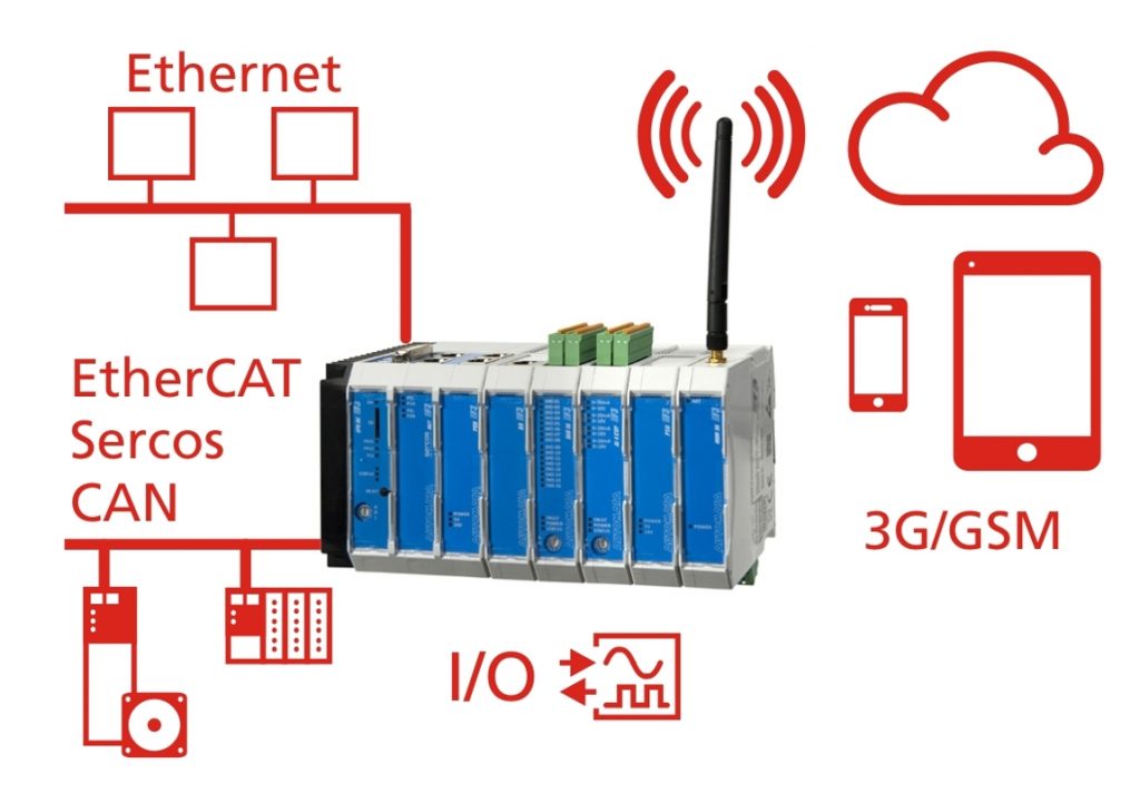Der Steuerung F3-Net von Cannon-Automata kombiniert moderne Kommunikationsmöglichkeiten und modulare I/Os in einem Gerät. So lassen sich Fertigungseinrichtungen oder Maschinen vernetzen und automatisieren. Das integrierte 3G/GSM-Modem ermöglicht einen drahtlosen Datenaustausch über das Internet und bietet E-Mail- und SMS-Funktionen. Als Schnittstellen stehen Ethernet und USB zur Verfügung. CAN, Ethercat und Sercos ermöglichen den Anschluss von Antrieben und dezentralen I/Os. Die integrierten Bibliotheken für Codesys erlauben es Programmierern, komplexe Kommunikationsaufgaben schnell und unkompliziert in Steuerungsapplikationen zu integrieren. Sie enthalten Funktionsbausteine für den Datenaustausch über das Internet und das Senden und Empfangen von E-Mails oder SMS-Nachrichten.