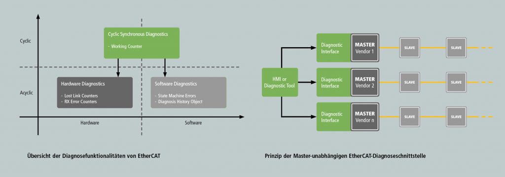 Die Ethercat-Technologie verfügt über ganz besondere Diagnoseeigenschaften, die über die entsprechenden Fähigkeiten des herkömmlichen Ethernet weit hinausgehen. Dabei werden die nötigen Informationen entweder über die Ethercat-Kommunikationschips (ESC) direkt in Hardware oder aber mittels Software-Funktionalitäten zur Verfügung gestellt. Auf Geräteseite sind daher keine speziellen Erweiterungen erforderlich. Jedes Ethercat-Datenpaket endet mit einem 16-Bit-Working-Counter-Feld, das von allen vom Datagramm selbst adressierten Geräten inkrementiert wird. Unstimmigkeit zwischen dem erwarteten und dem tatsächlich erhaltenen Wert des Working Counter bedeutet, dass nicht alle gekoppelte Geräte das Datagramm erfolgreich verarbeitet haben und daher nicht mit konsistenten Daten im aktuellen Zyklus arbeiten. Dies kann eine direkte Fehlerreaktion in der Steuerung anstoßen. Ist das der Fall, werden Eingangsdaten, die das Datagramm transportiert, verworfen. Die Steuerung kann azyklisch zusätzliche Informationen abrufen und ermöglicht so die Lokalisierung sowie die Erkennung etwaiger Gründe für das Kommunikationsproblem. Auf der Hardware-Seite überwacht und erkennt jeder Ethercat Slave Controller einen Leitungsverlust genauso wie eine Signalunterbrechung auf jedem Port und inkrementiert entsprechend den korrespondierenden Link Lost Counter oder RX Error Counter. Auf der Software-Seite hingegen können Kommunikationsfehler wie z.B. ein abgelaufener Watchdog auf den zyklischen Daten oder ein Synchronisationsverlust innerhalb des Netzwerks einen unerwarteten Zustandsübergang in der Ethercat State Machine auslösen. Diese Fehler werden vom AL Status Code angezeigt, der vom Software Stack zurückgegeben wird, wann immer ein unerwarteter Zustandsübergang eintritt.