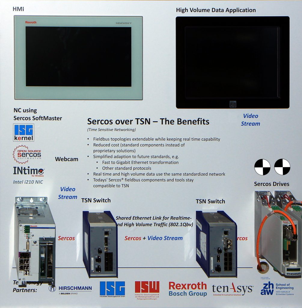 Sercos International zeigt auf der diesjährigen SPS IPC Drives 2016 die Übertragung des Sercos-III-Echtzeitprotokolls über IEEE802.1 Time-Sensitive Networks (TSN). Der TSN-Demonstrator wurde vom Institut für Steuerungstechnik der Werkzeugmaschinen und Fertigungseinrichtungen (ISW) der Universität Stuttgart mit Unterstützung von mehreren Industriepartnern realisiert. Er zeigt die Möglichkeit auf, eine echtzeit- und multiprotokollfähige Netzwerkinfrastruktur auf Basis von TSN für die Automatisierungstechnik und darüber hinaus bereitzustellen. Zum Einsatz kommt dabei ein TSN-basierter Sercos-III-SoftMaster mit einer Soft-CNC von ISG, der über TSN-Switche von Hirschmann mit Sercos-III-Servoantrieben von Bosch Rexroth kommuniziert. Über dieselbe Netzinfrastruktur lassen sich parallel dazu Videostreams einer Webcam zu einem Remote-Display übertragen, ohne jedoch Charakteristik und Funktionen der Sercos-Echtzeit-Kommunikation zu beeinträchtigen.