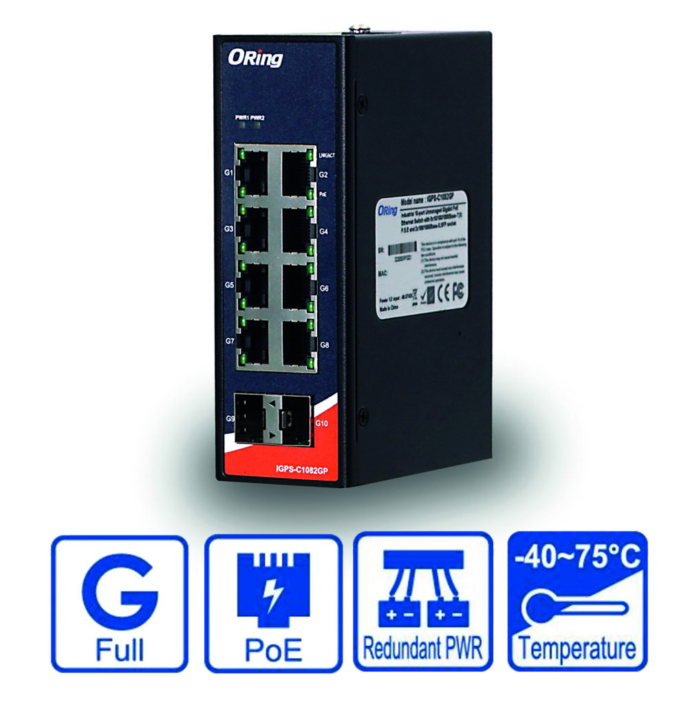 Der 10-Port-Unmanaged-GBit-PoE-Switch IGPS-C1082GP der neuen O-Ring-C-Serie von ICP Deutschland bietet eine robuste Lösung für industrielle Netzwerke in den Bereichen Überwachungssysteme, Fabrikautomatisierung und Industrie 4.0. Bei der C-Serie handelt es sich um eine günstigere Alternative zu den ansonsten gleichnamigen Standard-Switchen. Auf Merkmale, wie z.B. einen hohen Gehäuse-IP-Schutz oder redundanten Spannungseingang, die in vielen Applikationen wenig oder keinen Mehrwert erzeugen, wurde bei den Switchen der C-Serie verzichtet. Der Switch verfügt über acht 10/100/1000Base-T(X)-P.S.E-Ports. Er erfüllt die Anforderungen von IEEE802.3at PoE und bietet eine Gesamtleistung von 240W mit maximalen 30W pro Port. Damit eignet sich der Switch für zahlreiche PoE-fähige Geräte, wie Kameras, Access Points oder VoIP-Telefone. Er bietet zudem zwei Ports mit 100/1000Base-X-SFP-Sockets. Auto-Negotiation und Auto-MDI/MID-X-Funktion, Store-and-Forward-Übertragung und Flow Control gehören ebenfalls zur Ausstattung. Auch verfügt der Switch trotz C-Serie weiterhin über einen redundanten Spannungseingang sowie eine Relaisausgabe für ein Power-Failed-Warnsystem.