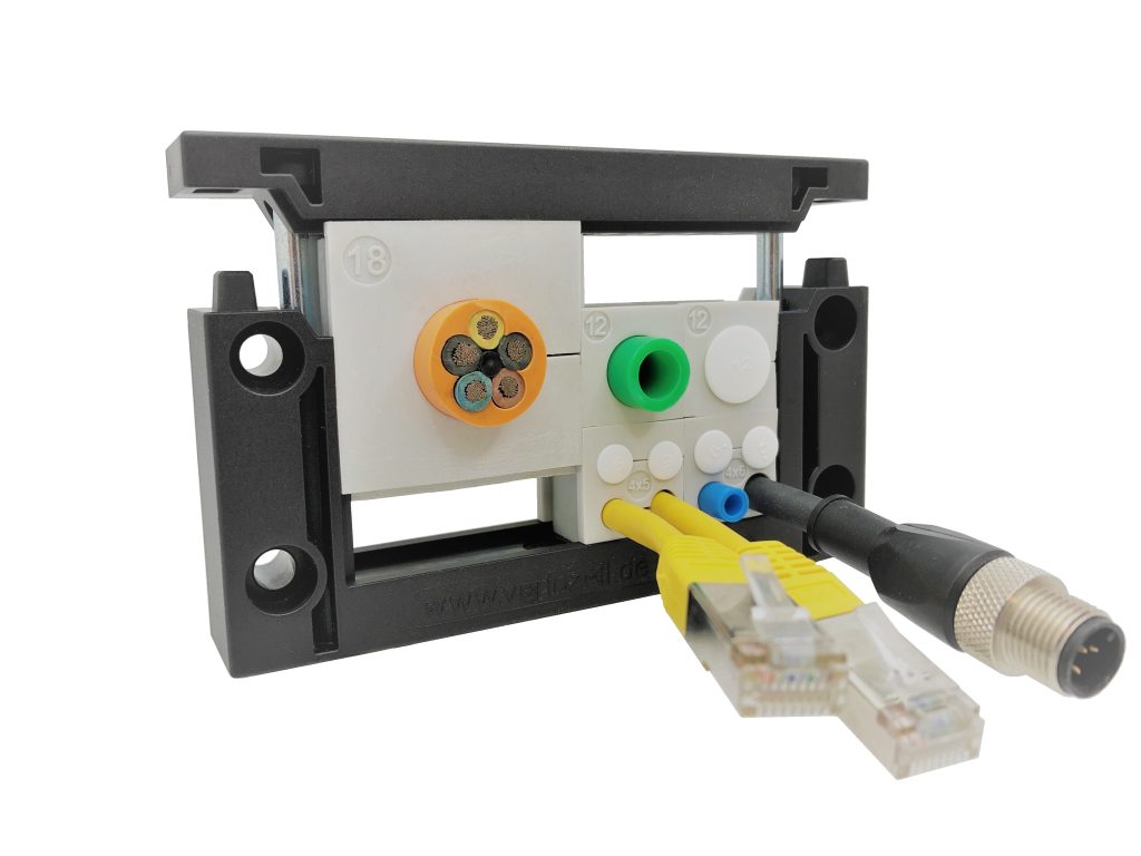 „Bisherige Produkte auf dem Markt erfüllten nicht alle Kundenanforderungen, ihnen fehlte vor allem die nötige Variabilität“, so Variozell-Inhaber Ralf Schmid. Stabilität werde bei diesen ähnlichen Produkten durch Zwischenstege erzielt, welche die Bestückungsvarianten einschränkten. Die KR- Kabeldurchführungssysteme können wahllos mit flexiblen Gummimodulen für unterschiedliche Kabeldurchmesser bestückt werden. Durch die seitliche Öffnung der Gummimodule ist auch eine Kabeleinführung von konfektionierten Leitungen mit Stecker möglich.