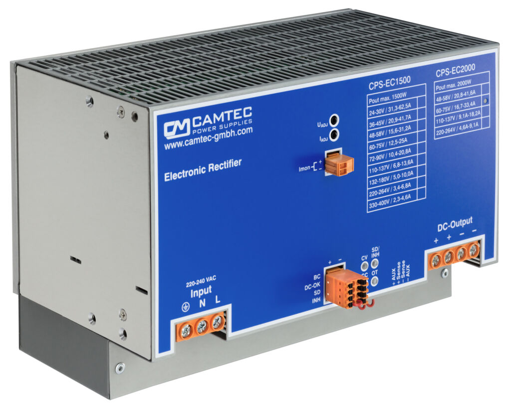 Mit seiner neuen AC/DC Netzteil-Serie CPS-EC2000 erweitert Camtec Power Supplies sein Portfolio an Industrienetzteilen für die DIN-Schiene. Beim mit Sic-Moseft-Technologie ausgestatteten Netzteilteil sind Spannung und Strom per Präzisionspotentiometer in einem sehr weiten Bereich exakt einstellbar. Die schnelle Reaktion auf Lastsprünge und die Restwelligkeiten liegen auf einem Niveau, das sonst nur Laborstromversorgungen bieten können. Zum Einsatz kommen die Hutschienennetzteile sowohl in der Fabrikautomation als auch in der Energieversorgung, Infrastruktur und Verteidigungsindustrie. Aktuell ist das Gerät mit Ausgangsspannungen von 48VDC bis 264VDC ausgestattet. Weitere Ausführungen sind in Vorbereitung. Features, wie die umfangreiche Power Good Überwachung der AC und DC Versorgung, Inhibit (Interlock), Remote Shutdown, Load Sensing, Current Monitoring und Boost Charge Mode sorgen für eine zielgenaue Kontrolle über die DC-Quelle.