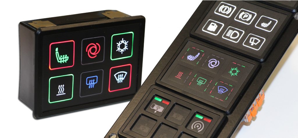 Griessbach hat sein Portfolio an Beleuchtungsoptionen für Bedien- und Eingabesysteme erweitert. Die neuen Funktionen lassen sich variabel für kundenspezifische Bedienlösungen adaptieren und können auch standardmäßig in CAN-Tastermodulen integriert werden. Zur Symbolhinterleuchtung sind die Module nun mit RGB-LEDs in frei wählfarben Farben ausgestattet. Überdies umfasst das erweiterte Beleuchtungskonzept eine umlaufende Ring- oder Segmentbeleuchtung für jedes Tasterfeld zur Statussignalisierung in den Ampelfarben, um Warn- oder Alarmsignale direkt am Taster kenntlich zu machen.