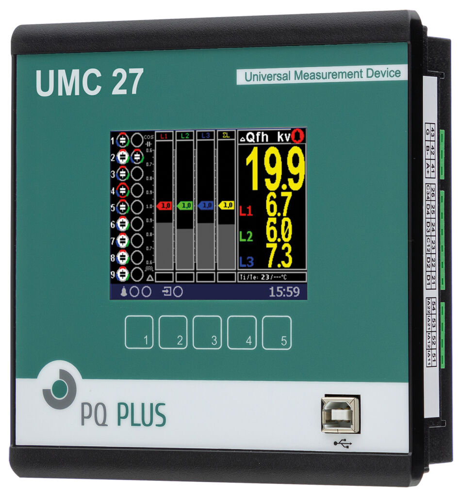 PQ Plus hat seine Blindleistungsregler erweitert und modernisiert. Das UMC24 ist ein kostengünstiges, robustes und leistungsfähiges kombiniertes Energiemessgerät und Blindleistungsregler in Einem. Es ist für die 3-phasige Messung von Live-, Mittel-, Minimal- und Maximalwerten vieler elektrischer Größen konzipiert sowie für die Oberschwingungsmessung bis zur 50. Harmonischen. Es besitzt neun Relaisausgänge und eine USB-Schnittstelle. Das Gerät misst Spannung und Strom im 4-Quadrantenbetrieb in Klasse 0,5 und die Arbeit in Klasse 0,5S. Zudem regelt es über das Schalten der Relaisausgänge und nachfolgender Kondensatorstufen auf den definierten Ziel cos phi. Durch eine Spannungsmessung bis zu 1090V ist es in 400V- und 690V-Netzen einsetzbar. In der advanced Version UMC27 sind zusätzliche Schnittstellen (Ethernet und RS485), 512MB Speicher, 18 Relaisausgänge und eine hochauflösende Messtechnik mit einer Abtastung von 57,6kHz enthalten, zudem kann es per MQTT kommunizieren. Optional ist auch die Messung von Supraharmonischen bis 9kHz und eine Oszilloskop-Funktion möglich. Die Geräte sind zur Fronttafelmontage mit 144x144mm Frontmaß geeignet. Das UMC24 verfügt über ein LC-Display und das UMC27 über ein farbiges Grafik-Display.
