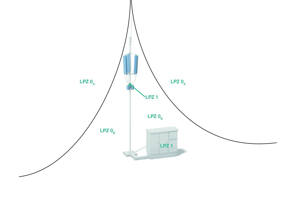 Dabei wird die Anlage in Blitzschutzzonen (LPZ – Lightning Protection Zone) unterteilt, und zwar von außen nach innen mit abnehmendem Gefährdungspegel. So können in den äußeren Zonen nur unempfindliche Betriebsmittel verwendet werden, in der inneren Zone hingegen auch empfindliches Equipment. Die einzelnen Zonen einer Mobilfunkanlage können dabei charakterisiert und benannt werden.