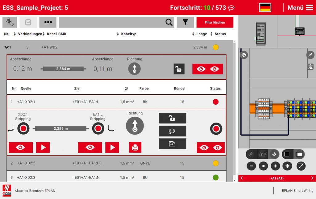Die Eplan-Plattform verbindet Softwarelösungen mehrerer Engineering-Disziplinen – von der Vorplanung über die Projektierung bis hin zur Konstruktion von Schaltanlagen und Kabelbäumen. Alle Anwendungen arbeiten auf einer einheitlichen Datenbasis. Mit einem Eplan-Projekt lässt sich ein vollständiges digitales Abbild für den Stromlaufplan sowie ein digitaler Zwilling für den Schaltschrank erstellen. Es dient als zentrale Informationsquelle für alle Komponenten sowie Maschinendaten in Engineering und Fertigung.