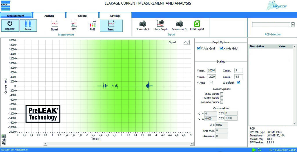 Üblicherweise würde man für die Messung des Differenzstroms zu einer Strom- oder Leckagezange greifen. Da Messzangen aber nur einen Istwert anzeigen, welcher einer gewissen Trägheit unterliegt, ist es mit ihnen nicht möglich, der Ursache der Auslösung im Moment des Kontaktherstellens oder -trennens von Stecker oder Schalter näher zu kommen.