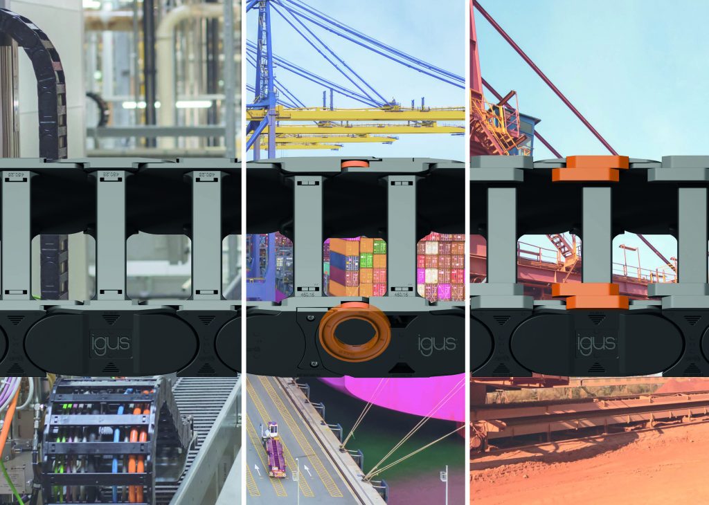 Igus hat den Baukasten für E4.1-Energieketten mit Gleitschuhen und Rollenkettengliedern ausgebaut. So sollen Anwender bei harten Umgebungen oder anspruchsvollen Anwendungen die Lebensdauer ihrer Anlagen kostengünstig erhöhen können. Die verschleißfesten Gleitelemente lassen sich einfach auf die Kettenglieder im Innenradius setzen. Sie bestehen aus einem hoch abriebfesten Polymer, welches die Lebensdauer der Energieführung bei Verfahrgeschwindigkeiten von 1 bis 3m/s verdoppeln kann. Weiter wurde das Baukastensystem um Rollenkettenglieder in zwei Größen erweitert, deren Einsatz sich vor allem bei hohen Geschwindigkeiten bis 10m/s oder sehr langen Verfahrwegen lohnt, da sich die Antriebsleistung laut Hersteller um bis zu 37% reduziert. Optional lassen sich alle Energieketten mit Lösungen für Zustandsüberwachung und vorausschauende Wartung ausstatten.