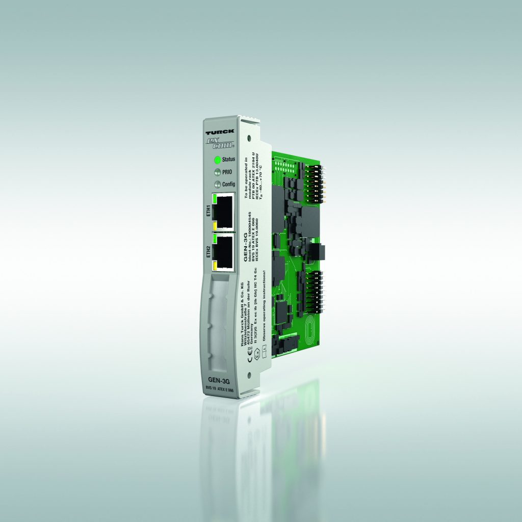 Mit dem Zone-2-Ethernet-Gateway für das I/O-System Excom von Turck gelangen sämtliche Prozessdaten in ausreichender Geschwindigkeit über einen parallelen Datenkanal in IT-Systeme zur Analyse und Auswertung – ein einfacher Weg zu effizientem Condition Monitoring und vorausschauender Wartung. Steuerungen und Leitsysteme bleiben davon unberührt und vor Zugriffen geschützt. Als Multiprotokoll-Gerät arbeitet das Gen-3G mit hohen Datenraten ohne manuellen Eingriff in Profinet-, Ethernet/IP- oder Modbus-TCP-Netzwerke. Der integrierte Switch des Gateways ermöglicht Linientopologien, die sich im Netzwerk leicht zum Ring schließen lassen. Für eine hohe Verfügbarkeit unterstützt das System neben den Hardware-Redundanzen für Netzteile und Gateways auch weitere Redundanzkonzepte.