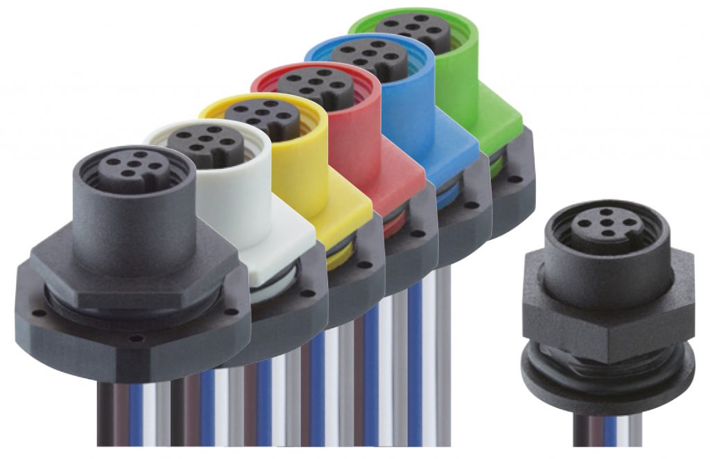Lutronic erweitert sein Produktprogramm um farbige M12-Stecker sowie M12-Kupplungen. Die Einbausteckverbinder aus PA-Kunststoff stehen in den Farben Schwarz, Weiß, Blau, Grün, Gelb und Rot zur Verfügung. Die A-kodierten Stecker und Kupplungen erfüllen die Schutzart IP67 und sind für die Frontmontage in Gehäusen bestimmt. Stecker und Kupplung in der Farbe Schwarz sind zudem für die Hinterwandmontage verfügbar. Als Besonderheit sind alle M12-Einbausteckverbinder mit 500mm-Litzen vorkonfektioniert. Darüber hinaus sind auf Nachfrage weitere Varianten realisierbar. Für den Temperaturbereich von -25 bis +80°C sind diese Typen 4-, 5- , 8- und 12-polig erhältlich mit davon abhängigen Bemessungsströmen von 1,5A (12-polig) bis 4A (4-polig) und Bemessungsspannungen von 30V (12-polig) bis 250V (4-polig).