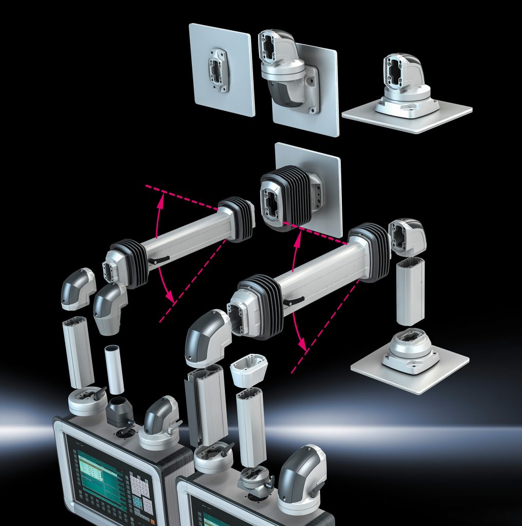 Mit seinen Tragarmsystemen CP 40/60/120/180 bietet Rittal ein flexibles System an, mit dem Bedienterminals in allen denkbaren Anwendungen montiert werden können. Die Zahl hinter CP steht dabei jeweils für das maximale Gewicht, das ein Tragarm von einem Meter Länge tragen kann. Die Systeme haben entsprechend unterschiedlich große Profile. Über Adapter lassen sich die verschiedenen Versionen des Tragarmsystems einfach miteinander kombinieren. Im Inneren der Profile ist viel Platz für Leitungen. Die Gelenke und Adapter sind dabei so ausgelegt, dass auch vorkonfektionierte Leitungen mit Steckverbindern durch die Öffnungen passen. Das spart Zeit beim Verlegen der Leitungen, da die Installation von Steckern, die vor allem bei Leitungen im IT-Bereich aufwändig ist, entfallen kann. An den Tragarm kann ein Gehäuse mit dem kompletten Bedienterminal installiert werden. Alternativ ist auch die Montage nur eines Monitors über einen Vesa-Adapter möglich. Um die Flexibilität zu erhöhen, bringt Rittal nun ein höhenverstellbares Tragprofil auf den Markt. Damit wird die flexible Positionierung des Bedienterminals auf die dritte Dimension erweitert. Die Ergonomie bei der Maschinenbedienung wird dadurch weiter verbessert. Insbesondere, wenn unterschiedlich große Mitarbeiter an einer Maschine arbeiten, kann das Bedienterminal mit dem höhenverstellbaren Tragprofil auf die jeweils optimale Arbeitshöhe eingestellt werden. Ebenso ist es möglich, das Bedienterminal aus dem Arbeitsbereich zu schwenken oder so zu positionieren, dass man den Bildschirm und den Arbeitsvorgang in der Maschine gleichzeitig beobachten kann. Das höhenverstellbare Tragprofil ist in zwei Varianten mit den Gewichtsbereichen 4kg bis 30kg und 10kg bis 60kg erhältlich.