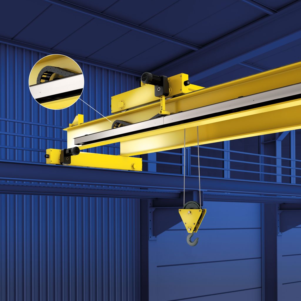 Mit Easy Guide System von Tsubaki Kabelschlepp kann zum Beispiel bei Hallenkranen auf lose herabhängende Festoon-Schlaufen verzichtet werden. –