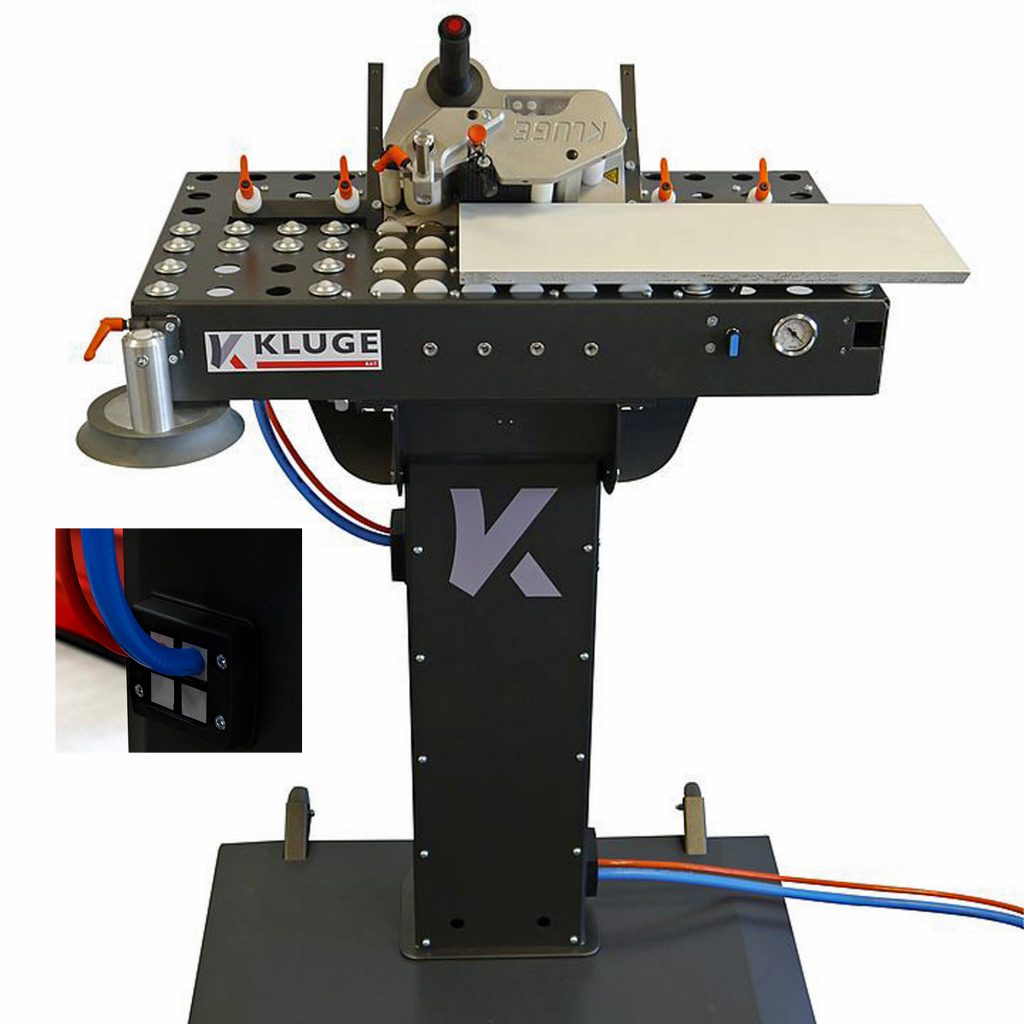 Im Holzbereich ist die „optische Nullfuge“, auch „Laserkante“ genannt, das Maß aller Dinge. Sie bezeichnet die kaum wahrnehmbare und farblich abgestimmte Verbindung zwischen Plattenoberfläche und Schmalkantenbeschichtung. Die erforderliche Technik war für Handwerksbetriebe bisher relativ teuer und mobil kaum umsetzbar. Eine Alternative etabliert das Unternehmen Aggregate und Sonderbau Kluge. Es hat einen mobilen Nullfugenbekanter entwickelt, der ohne zusätzliche Peripherie auskommt. Zusammen mit dem optionalen Bearbeitungstisch BAT lässt sich das Gerät als stationäre Arbeitsstation in der Werkstatt oder auf der Baustelle verwenden. Für die Druckluft und Stromzuführung der Tische setzt Kluge auf das Kabeldurchführungssystem KDS Click von Conta-Clip. Die Entscheidung erfolgte sowohl aus praktischen als auch aus designspezifischen Gründen. Durch die standardmäßige Bestückung lässt sich der Bearbeitungstisch jederzeit kundenspezifisch erweitern. Zudem fügt sich das Kabeldurchführungssystem harmonisch in die klare Linie des Bekanters ein und erübrigt bei nachträglicher Umkonfiguration der Verkabelung neue Bohrungen oder Verschraubungen. Es müssen nur die Blindstopfen gegen die gewünschten Dichtelemente getauscht werden. Mit dem werkzeuglos montierbaren KDS Click lassen sich unkonfektionierte und konfektionierte Leitungen durch Gehäuse- und Schaltschrankwände führen. Aufgebaut nach einem einfachen Baukastenprinzip, besteht es aus drei Grundkomponenten. Diese sind bedarfsgerecht für Kabel, Leitungen oder Schläuche konfigurierbar. Conta-Clip bietet sein System mit Schutzart IP66 für vier, sechs, acht oder zehn Dichtelemente an, die es in über 100 unterschiedlichen Varianten gibt. Ihre konische Form ermöglicht das einfache Ein- oder Herausdrücken auf der Innenseite der zuvor angebrachten Inlays. Neu- oder Nachverkabelungen lassen sich unkompliziert ausführen.