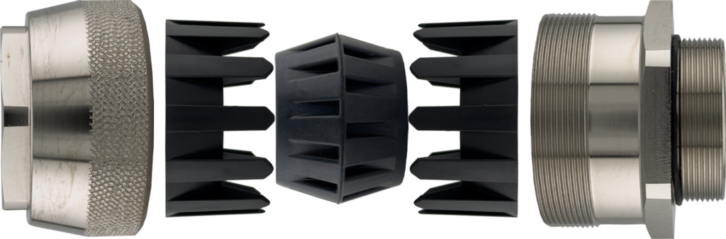 Die neue Kabelverschraubung Gogafix MSKO von Gogatec ist speziell für extreme Zugbeanspruchungen ausgelegt und erreicht eine Zugfestigkeit von bis zu 1.000N. Anwendungen dafür finden sich in Bereichen mit schweren oder häufig bewegten Kabeln, beispielsweise bei Schnellladestationen für Elektrofahrzeuge, Hängevorrichtungen mit großen Leitungsquerschnitten, leistungsstarken Antrieben mit beweglicher Montage, in Datencentern oder im Bahnbereich. Die Verschraubung verfügt über ein metrisches Gewinde M50 x 1,5 mit einer Gewindelänge von 15mm und deckt einen Klemmbereich von 38 bis 42mm ab. Das Gehäuse besteht aus vernickeltem Messing, wodurch eine hohe Korrosionsbeständigkeit und mechanische Stabilität gewährleistet sind. Für die Abdichtung kommen wahlweise EPDM (UL-94-V0) oder Chloropren (UL94-V2) zum Einsatz, je nach spezieller Anforderung bei Einsatz in oben angeführten Anwendungen. Der Einsatzbereich ist auf Temperaturen von -40 bis +100°C ausgelegt, kurzfristig sind bis zu +120°C möglich. Die Verschraubung erfüllt die Schutzart IP68 und ist somit staub- und wasserdicht.
