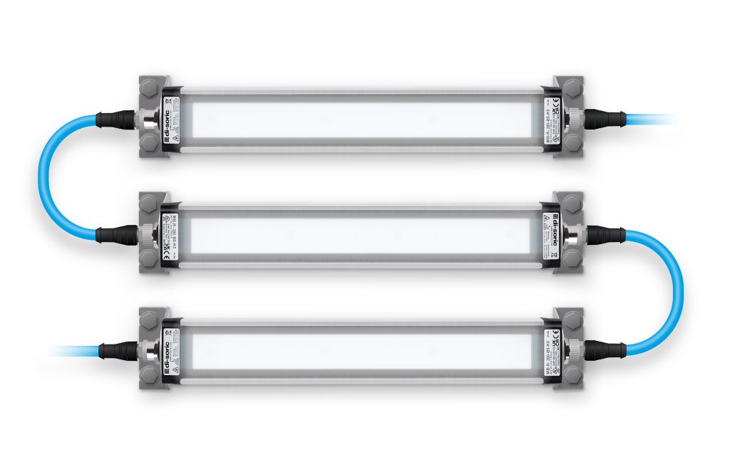 Die neuen schock- und vibrationsresistenten All-in-one-Maschinenbeleuchtungen der Serie MB-R von Di-Soric mit Kaskadierfunktion sind mittels Steckverbindungstechnik schnell und einfach installiert. Mit ihrem robusten Aluminiumgehäuse und einem 3mm starken gehärteten Sicherheitsglas trotzen sie nach IP67 rauen und schmutzigen Einsatzumgebungen im Temperaturbereich zwischen -20 und plus +50°C. Die LED-basierten Lichtquellen spenden ein angenehmes, neutrales Weißlicht (5.000 K). Der integrierte Diffusor sorgt im Maschinenraum für gleichmäßige Lichtverteilung ohne Streulicht. Mit ihren unverlierbar integrierten Haltewinkeln sind die Leuchten schnell auf das Prozessfeld ausgerichtet und unmittelbar betriebsbereit. Sie sind in sieben Baulängen von 190 bis 1.540mm und mit Beleuchtungsstärken von 2.000 bis 5.100lx erhältlich. Sie sollen langlebig sein und ein überdurchschnittlich gutes Preis-Leistungsverhältnis haben. Zudem decken sie ein breites Einsatzfeld ab: Entlang von Montagebändern oder Prüflinien reduziert die Aneinanderreihung der kaskadierbaren Beleuchtungen dank einfacher M12-Steckverbindern Zeit und Kosten. Unterschiedlich große Roboterzellen und Bearbeitungszentren lassen sich mit den kompakten Varianten der neuen Serie zielgenau ausleuchten. Damit erhalten sowohl Maschinenbediener als auch integrierte Vision-Systeme eine konstant gute Sicht auf den Prozessablauf.