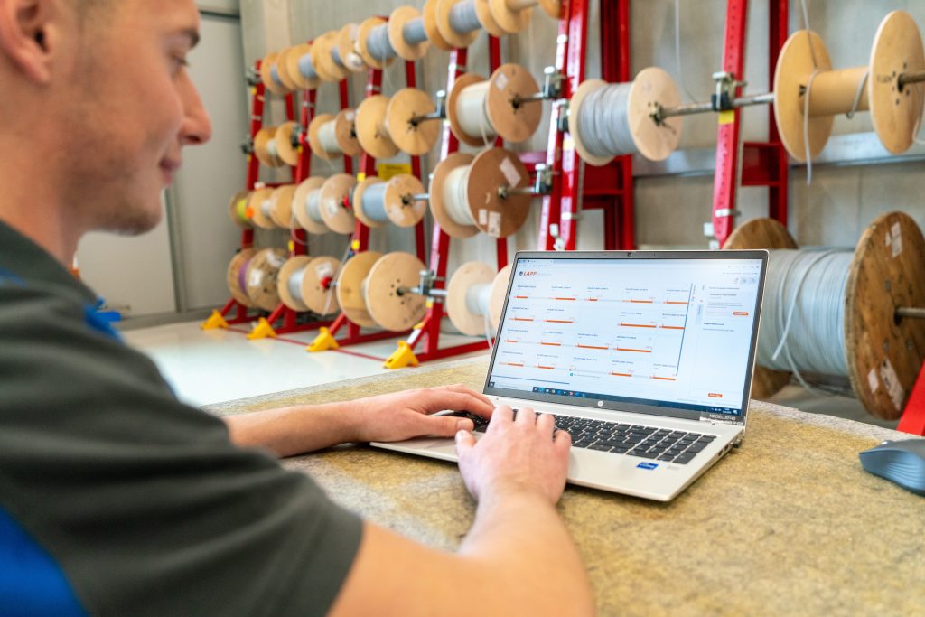 Die Steuerleitung Ölflex Classic 110 und Datenleitung Unitronic LiYCY von Lapp sind z.B. wesentliche Komponenten für die Kartoniermaschinen. Unzählige Meter davon werden jeden Tag verbaut. Zwei Regale mit jeweils etwa 40 Kabeltrommeln stehen griffbereit zur Verfügung. „Die Verwaltung unseres Kabelbestands war lange Zeit eine Herausforderung für uns“, sagt Christian Ehe. „Es kam schon vor, dass eine Kabeltrommel plötzlich leer war und kein Ersatz vorhanden war, sodass wir die Maschine an diesem Tag nicht weiterbauen konnten.“ Früher verschafften sich die Mitarbeiter durch regelmäßige Kabelinventuren einen Überblick über die verbleibenden Bestände und bestellten bei Bedarf nach. „Das hat uns aber Zeit und Ressourcen gekostet“, betont der Teamleiter Elektromontage, „und es war ein fehleranfälliger Prozess, wenn beispielsweise ein Kollege durch Krankheit ausfiel und daraufhin die Bestellung ausblieb.“ Eine höhere Lagerhaltung wurde als Lösung schnell verworfen, fügt er hinzu: „Das hätte zu viel Kapital gebunden, außerdem fehlte uns der Platz dazu.“ Eine digitale Just-in-time-Lösung klang attraktiv – und Lapp konnte diese Anforderung mit dem Kabelbestandsmanagement erfüllen.