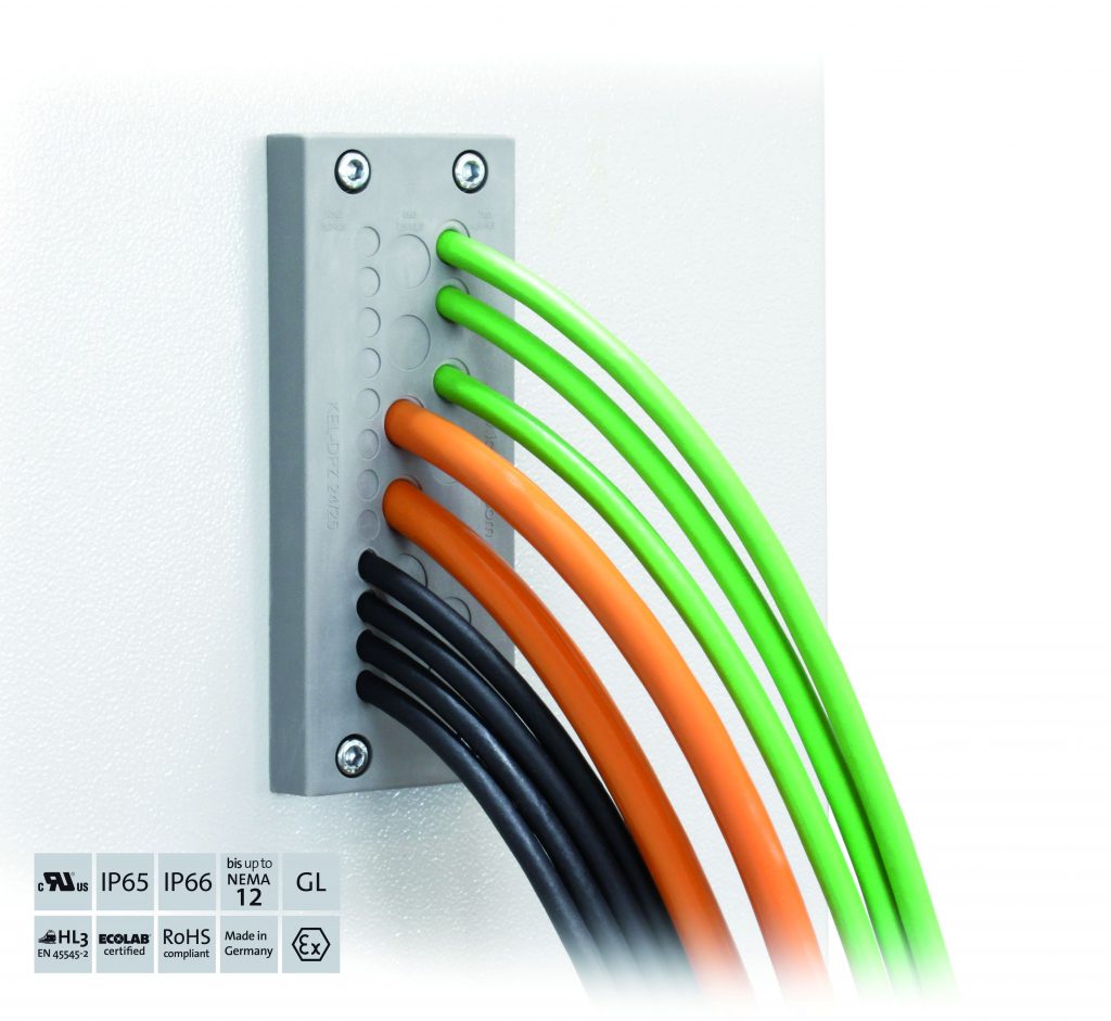 Icotek hat seine Kabeldurchführung KEL-DPZ 24 zur Einführung nicht konfektionierter Leitungen verbessert. Die Kabeldurchführung zeichnet sich durch ihre hohe Packungsdichte aus. So lassen sich mit einem Bauteil bis zu 121 Leitungen einführen. Dabei entspricht die Kabeldurchführung in Ausbruchgröße und Bohrbild den Normausbrüchen von 24-poligen schweren Steckverbindern. Anwender haben die Möglichkeit, Leitungen, Lichtwellenleiter, Schläuche oder Kabellitzen im Durchmesserbereich von 1,5 bis 22mm einzuführen, abzudichten und gleichzeitig gegen Zug zu entlasten. Mit acht unterschiedlichen Ausführungen lassen sich zahlreiche Kombinationen und Durchmesservarianten erstellen. Dabei kommen verschiedene Klemmbereiche für die Leitungen zum Einsatz, die die Kabeldurchführung zu einer flexibel einsetzbaren Lösung machen. Konisch zulaufende Tüllen an der Rückseite sorgen für eine zweifache Abdichtung der Leitung. Öffnungen, die Anwender nicht mehr benötigen, lassen sich mit ST-B-Stopfen sicher verschließen. Die Schutzart IP65/IP66 bleibt so erhalten. Der robuste und stabile Polyamidkorpus der Kabeldurchführung ist vollständig mit einer Membran aus Elastomer umspritzt. Zur Bestückung durchstechen Anwender die Membranen mit einem kleinen spitzen Dorn und schieben anschließend die Leitung hindurch. An der Maschine oder am Gehäuse lässt sich die Kabeldurchführung zudem einfach aufschrauben.