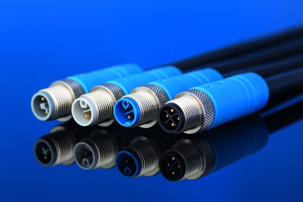 Familienbild mit Power: Die M12 Power Serie ist komplett. Die HUMMEL AG präsentiert auf der SPS in Nürnberg eine Vielfalt an Bauformen und Varianten der Steckerserie M12 Power. –