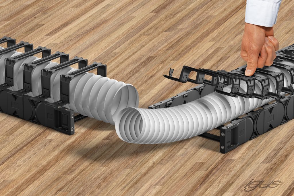 Um große Schläuche sicher führen zu können, hat Igus ein neues Bügeldesign für seine modulare Energiekettenserie E4Q entwickelt. Der Bügel lässt sich mithilfe eines Adaptersystems auf die Energiekette montieren. Zum Einlegen der Schläuche, die z.B. in der Holzindustrie zum Einsatz kommen, setzt der Hersteller Öffnungsstege ein, die sich komplett ohne Werkzeug öffnen und schließen lassen und in 15 verschiedenen Breiten verfügbar sind. Dies soll dem Anwender eine hohe Variabilität bei der Konfiguration seiner Energieführung ermöglichen. Durch den Einsatz der Bügel vergrößert sich der Innenraum der Energiekette. So können neben den Schläuchen auch weitere Leitungen untergebracht und geführt werden. Mit dem Programm an kabelschonenden Innenaufteilungselementen ist die Energiekette einfach zu unterteilen. Auch Kosten sollen sich mit der neuen Bügelkette einsparen lassen, denn statt einer großen Energiekette kann der Anwender einfach eine kleinere Kette mit Bügeln für mehr Innenhöhe einsetzen.