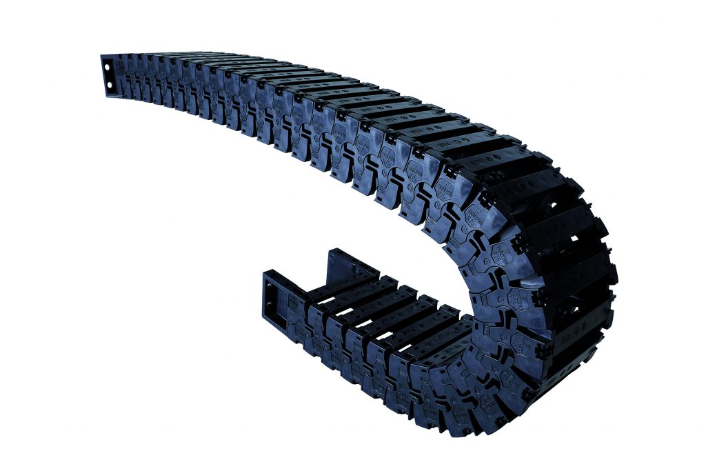 Durch sein Abriebvehalten ist das Leitungsführungssystem TKR von Tsubaki Kabelschlepp für Reinräume geeignet. Die Formgebung der Verbindungselemente erhöht zusätzlich die Lebensdauer des Systems. Die beweglichen Elemente sind direkt an den Kettengelenken angespritzt und müssen nicht als zusätzliches Teil montiert werden. Im Gegensatz zu konventionellen Bolzen-Bohrung Verbindungen soll so nahezu kein Verschleiß (Gelenkabrieb) entstehen und der sogenannte Polygoneffekt reduziert werden. Aufgrund dieser Eigenschaften sind die Leitungsführungssysteme neben Reinräumen u.a. für den Einsatz in Handling- und Montagesystemen, Pick&Place-Automaten sowie in Druck- und Textilmaschinen geeignet. Die TKR-Serie ist in fünf Typenreihen mit Krümmungsradien zwischen 40 und 200mm erhältlich. Anschlusselemente sind mit oder ohne Zugentlastung erhältlich. Die modulare Bauweise ermöglicht ein flexibles Kürzen und Verlängern des Leitungsführungssystems.