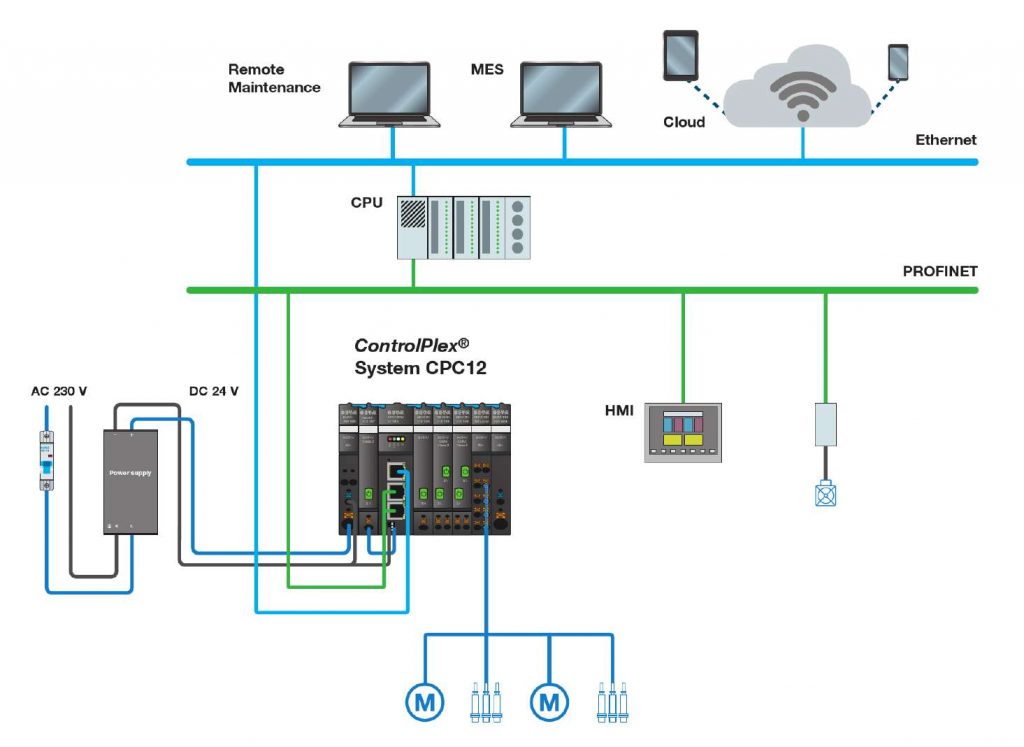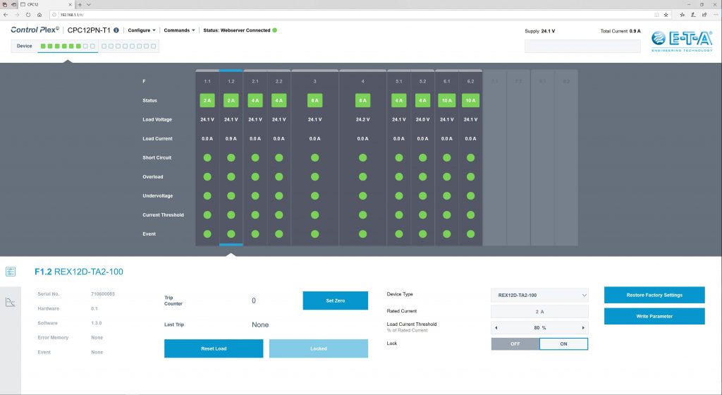 Der eigentliche Vorteil beginnt aber erst bei der Inbetriebnahme einer Maschine oder Anlage mit einem kommunikativen Stromverteilungssystem. Das ControlPlex System CPC12 hat einen integrierten Webserver an Board. Dieser zeigt alle Informationen, die das System zur Verfügung stellt, bereits beim ersten Versorgen mit Spannung an. Er lässt sich in Betrieb nehmen, ohne dass in der SPS bereits ein Programm läuft. Der Webserver zeigt den Nennstrom und den aktuellen Laststrom für jeden Kanal einzeln an. So sieht man auch ohne ein zusätzliches Messgerät, ob das geplante mit dem tatsächlich Angezeigten übereinstimmt. Gelegentlich kommen während der Planung noch Änderungen dazu, die beim Anpassen des Überstromschutzes übersehen werden. Dies fällt sofort auf und ist schnell und ohne langes Suchen anpassbar. Da das Gerät die Eingangsspannung und den Gesamtstrom ermittelt und anzeigt, hat der Betreiber auch grundlegende Informationen über das Schaltnetzteil. Beispielsweise darüber, ob es bereits an der Grenze betrieben wird oder ob noch genügend Reserven vorhanden sind. Dies wird vor allem dann interessant, wenn erweitert werden soll. Einmal konfiguriert, lässt sich diese System-Konfiguration abspeichern und bei einem Nachbau oder identischen System direkt wieder einspielen. Der größte Nutzen kommt beim Betrieb der Maschine oder Anlage zum Tragen. Natürlich ist es am besten, wenn man vom Überstromschutz nichts hört und sieht, denn dann läuft die Maschine bzw. Anlage einwandfrei. Aber auch hier ist es durch eine einstellbare Vorwarnschwelle möglich, Veränderungen zu melden, bevor eine Auslösung zum Stillstand führt. Die Messwerte können an eine Cloud gesendet werden. Sie sind, zusätzlich zu anderen Informationen, ein wichtiger Teil für die vorbeugende Instandhaltung.