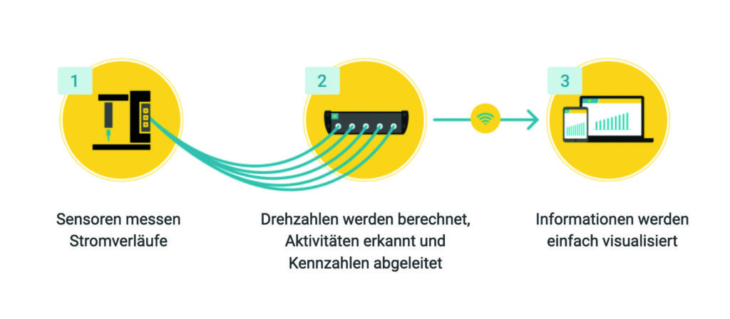 Das Herz des Systems ist die Smartbox. In ihr steckt die Intelligenz des Systems: ein Analog/Digital-Encoder und entsprechende Prozessoren für die Signalverarbeitung, -analyse und -interpretation. Die Box tastet den Stromverlauf der Maschine ab, digitalisiert, speichert und verarbeitet die Daten und überträgt sie sicher in die Cloud. Sie zeigt die Maschinenaktivität, den Energieverbrauch und bei Bedarf auch die Bearbeitungsteil-Mustererkennung an.