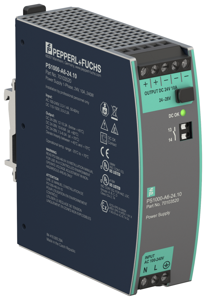 Die Serie PS1000 umfasst Geräte mit ein- und dreiphasiger Stromversorgung. In verschiedenen Ausführungen und Leistungsklassen gewährleisten sie eine zuverlässige Spannungsversorgung mit 12, 24 oder 48VDC bei einer Ausgangsleistung von 5 bis 40A. Außerdem steht ein DC/DC-Modul zur Verfügung, das als Repeater fungieren kann. Die Geräte sind für explosionsgefährdete Bereiche geeignet und verfügen über Zulassungen nach ATEX, IECEx sowie die Marine-Zulassung DNV. Sie sind auch für den nordamerikanischen Markt zertifiziert und können bis Zone 2/Div. 2 eingesetzt werden. Die Produktpalette umfasst außerdem spezifische Module zur Sicherung der Anlagenverfügbarkeit durch redundante Auslegung. Sie sind sowohl in einer n+1- als auch in einer 1+1-Topologie einsetzbar.