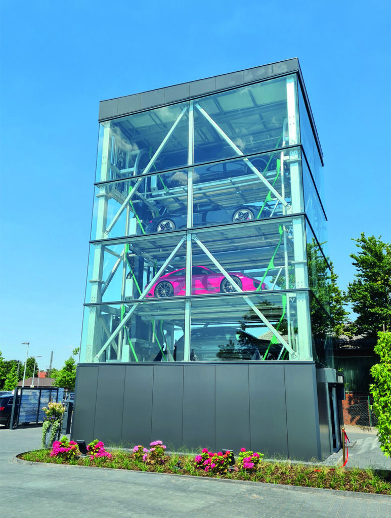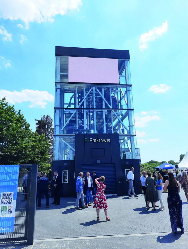 Doch zurück zum Ausgangspunkt: was ist eigentlich ein Parkturm? Die Besonderheit dieses Parkhauses besteht darin, dass die einzelnen Parkplätze in einer Art der Paternostertechnik angeordnet sind, die man von Aufzügen kennt. Dabei sind die Stellplätze als Gondeln angeordnet und können um bis zu 180° gegen und mit dem Uhrzeigersinn verfahren werden. Das hat den Vorteil, dass bis zu 16 Autos übereinander angeordnet werden können – auf einer Parkfläche, auf der sonst nur drei Autos Platz finden würden. „Gerade in Städten wird Platz immer wertvoller“, erläutert Manuel Huch, CEO von E-Parktower. „Es ergibt deshalb wenig Sinn, wertvolle Fläche für riesige Parkplätze zu opfern.“ Der Parkturm ist deutlich effizienter als klassische Parkhäuser oder Tiefgaragen. Weitere Pluspunkte: Der Parkturm ist mobil und kann flexibel umplatziert oder erweitert werden. Zusätzlich bietet er digitale Werbefläche, Ladepunkte für E-Autos sowie Schutz vor Diebstahl und Vandalismus.