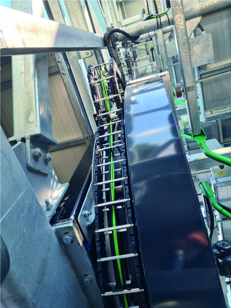 Tsubaki Kabelschlepp musste gemeinsam mit dem Team von E-Parktower bei dieser Anwendung also neue Wege beschreiten. „Wir haben eine Energieführungskette mit zwei Einspeisepunkten entwickelt“, erläutert Heinrich. „Über diese zwei Einspeisepunkte werden jeweils die Hälfte der Leitungen in die Kette eingeführt und treten dann an einem Übergabeblech in der Mitte der Kette wieder aus.“ Von dort aus wird jede einzelne Gondel mit Strom und Daten versorgt. Um die Kette aus den jeweiligen Endstellungen wieder zurückzuverfahren, ist es notwendig, die Kette mit zwei Treibrädern zu bewegen. Diese liegen formschlüssig auf beiden Seiten der Energieführungskette an. Für die Kraftübertragung der Treibräder musste eine komplett neue Energieführungskette entworfen werden. Aufgrund des großen vertikalen Verfahrweges der Kette sowie den zahlreichen Wechselbiegungen der Leitungen war darüber hinaus eine neue Art der Führung und Zugentlastung nötig.