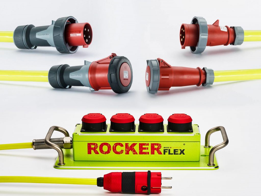 Das neue Rockerflex-Portfolio von TKD wurde als Baukastensystem für die speziell gehärteten und armierten Verlängerungskabel konzipiert. Während konventionelle Standard-PVC-, Gummi- oder PUR-Leitungen schon bei einer Zugbelastung von 20kg in die Knie gehen, nehmen es diese speziell konstruierten Verlängerungskabel mit bis zu 70-mal größerem mechanischem Stress auf. So sind etwa die 3X1,5mm²-Varianten der Serie bei entsprechender Fixierung für eine Zugbelastung von 1.350kg ausgelegt. Dies bedeutet störungsfreien und sicheren Betrieb, auch unter extremen Bedingungen. Bei der Konstruktion der Leitungen, die mit Querschnitten bis zu 5X240mm² aufwarten und für harte Einsätze von 230V/16A bis 1.000V/400A ausgelegt sind, greift die Kombination aus hochflexiblem, verzinntem Kupfer als Leiter und einem eigens entwickelten Special-Compound auf Polyurethan-Basis (PUR), der sowohl bei der Isolation wie beim Außenmantel zum Einsatz kommt. Bei der Armierung wird auf ein Geflecht aus hoch reißfester Kunstfaser mit 100% Bedeckung gesetzt. Das Ergebnis sind speziell gehärtete Verlängerungskabel, die sich durch höchste Abrieb- und Schnittfestigkeit, Vibrations- und Rüttelfestigkeit, Verrottungs- und Wetterbeständigkeit, Reißfestigkeit und hohe Elastizität sowie geringes Gewicht auszeichnen. Abgedeckt wird ein Temperaturbereich von -50O°C bis 80O°C, wobei die Leitungen selbst bei niedrigen Temperaturen durch sehr hohe Flexibilität bestechen. Das Einsatzspektrum der neuen Systeme reicht von Industrie und Handwerk über den breitgefächerten Bausektor (Hoch-, Tief-, Straßen- und Tunnelbau), die Hafentechnik sowie Mining und Bergbau bis zur Klär- und Abwassertechnik, Offshore & Onshore-Projekten und der Petrochemie. Angeboten werden die Leitungen, nach dem Plug&Play-Prinzip, als fertige Sets – also mit installierten Steckern und Kupplungen. Serienmäßig gibt es sie auf 5, 10, 25 oder 50m abgelängt. Alternativ können auch kundenspezifische Längen geordert werden. Verfügbar sind die Rockerflex-Verlängerungskabel in fünf verschiedenen Varianten. Sie unterscheiden sich durch die jeweilige Schutzklasse (von IP44 bis IP67) und die eingesetzten Steckertypen. Das Spektrum reicht von Schuko-Steckern über Schweizer Steckvorrichtungen bis zu CEE- und Hochvoltanschlusssystemen. Abgerundet wird das Portfolio durch eine staub- und spritzwassergeschützte Powerboard-Steckdosenleiste in IP54-Ausführung. Die Leiste, die es wahlweise mit 5 oder 10m Kabel gibt, umfasst insgesamt vier Einbausteckdosen. Erkennungsmerkmal der Rockerflex-Serie ist der in grellem Signalgelb gehaltene Außenmantel, der sich kundenspezifisch bedrucken lässt.