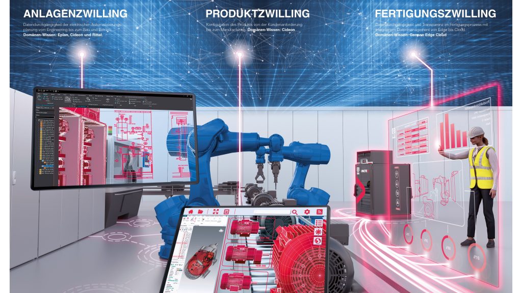 Abschließend werden den Teilnehmern ausführlich die Möglichkeiten für eine Low-Code/No-Code-Integration und der dahinter stehenden Plattform vorgestellt. Darauf aufbauend zeigen die Referenten den Teilnehmern die Möglichkeit der Visualisierung der gewonnenen Daten, inklusive der Integration der Daten von Produktzwilling (Cideon) und Anlagenzwilling (Eplan und Rittal), um eine nahtlose Visualisierung der Prozesse zu ermöglichen und dadurch auch die Gestaltung des dritten digitalen Zwillings – des Fertigungszwillings, der durch die Virtual Factory mehr Transparenz und Verbesserungsmöglichkeiten in den Fabrik- und Produktionsprozessen bietet.