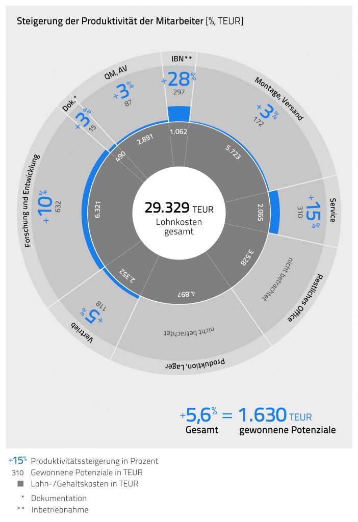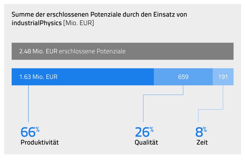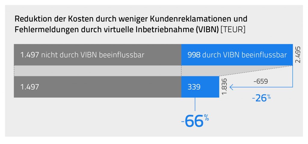 Um diese Potenziale tatsächlich beziffern zu können, wurde exemplarisch bei einem typischen mittelständischen Maschinenbauer zunächst eine Bestandsaufnahme durchgeführt und Prozesskennzahlen wie Durchlaufzeiten, Reklamations- und Fehlerquoten, KPIs laufender Projekte und Personalkosten ermittelt. Anschließend wurde ein kundenspezifisches Konzept mit einem Regelwerk zum Simulationseinsatz entwickelt. Das zeigt, wie eine virtuelle Inbetriebnahme optimal im Unternehmen verankert und gelebt werden kann. Ein Jahr nach Projektbeginn wurden diese Kennzahlen erneut ermittelt. Stellt man nun die ermittelten Kennzahlen mit und ohne virtueller Inbetriebnahme und digitalem Zwilling gegenüber, so zeigt sich, dass der Kunde in diesem Beispiel durch die vollständige entwicklungsprozessbegleitende Implementierung Einsparungen in Höhe von rund 2,5Mio. € erzielt hat. Davon entfallen rund zwei Drittel auf die Erhöhung der Mitarbeiterproduktivität. 26 Prozent der Einsparungen konnten durch die Verbesserung der Qualität und die Messung der Reduktion der Qualitätskosten durch den Rückgang der Kundenreklamationen und Fehlermeldungen erzielt werden. Acht Prozent entfallen auf die Einsparung gemessen an der Erhöhung der Liefertermintreue und der Reduktion von Vertragsstrafen.