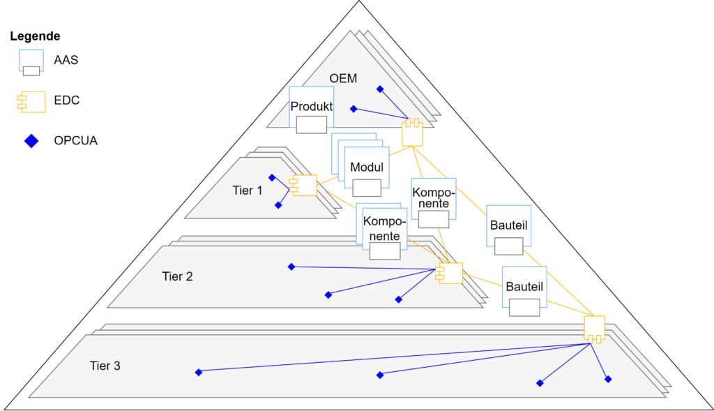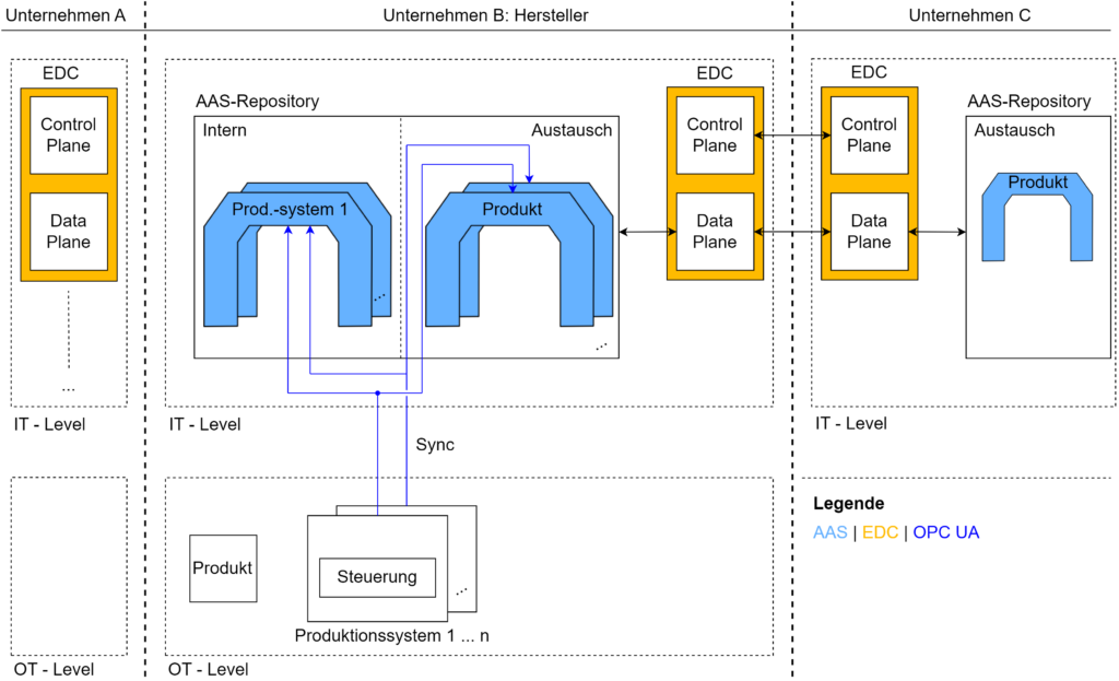 Die architektonische Umsetzung und das Zusammenspiel der beschriebenen Lösungsbausteine können folgendermaßen aussehen: Jeder Akteur betreibt lokal einen AAS-Hosting Service (AAS Repository), welcher alle für das Unternehmen relevanten AAS enthält. Sie können ursprünglich von den Zulieferern bereitgestellt oder selbst instanziiert worden sein. In der Betriebsphase werden die AAS kontinuierlich um weitere Informationen angereichert. Das Datenupdate erfolgt über Synchronisierungsverbindungen zum Shopfloor (OT-Ebene). Dazu laufen auf den Produktionssystemen, Maschinen und Geräten OPC UA Server bzw. Publisher, die CS-Daten bereitstellen, welche in die AAS geschrieben werden. Der ebenfalls von jedem Akteur lokal betriebene EDC verfügt über eine AAS-Erweiterung, die den Zugriff auf das AAS Repository gewährleistet, das für den unternehmensübergreifenden Datenaustausch vorgesehen ist. Über den EDC lassen sich Daten anderer Akteure anfragen. Im Erfolgsfall der automatisierten Vertragsverhandlung können ganze AAS oder eine Referenz auf eine AAS des eigenen Hosting Services übertragen werden. Bei der Referenz bestimmt der Dateninhaber über die Art und Dauer der Zugriffsrechte. Zusammengefasst entsteht durch die verwendeten Technologien und deren Zusammenspiel ein Datenraum nach demokratischen Werten – eine Datokratie.