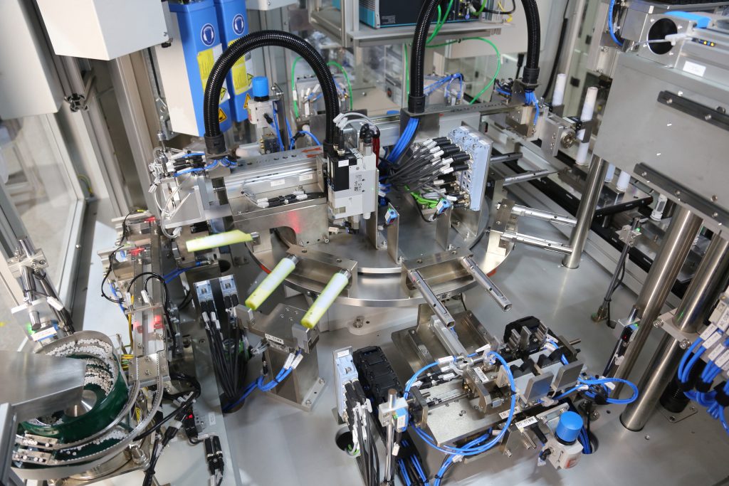 Ultraschall-Schweißstation mit Rundschalttisch, in der das Handling von stabförmigem Gehäuse vollautomatisiert vorgenommen wird – Bild: Weiss GmbH