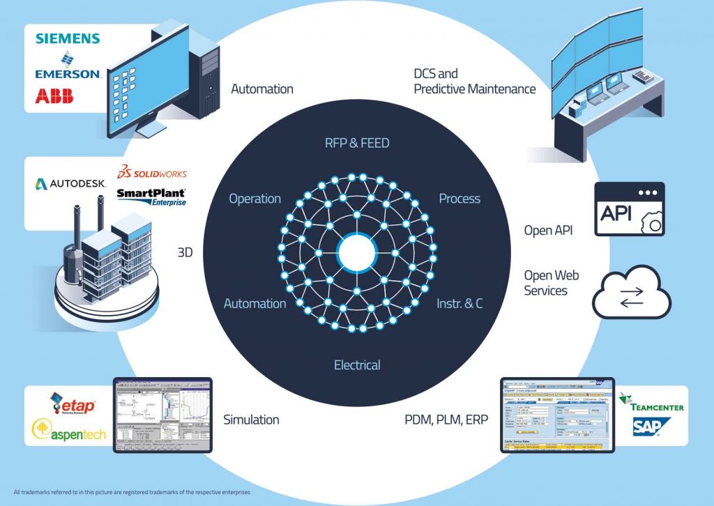 Das universelle Modell in EB ist die Basis für alle Kerndisziplinen des Anlagen-Engineerings und die Kommunikation mit ergänzenden Systemen. – Bild: Aucotec AG