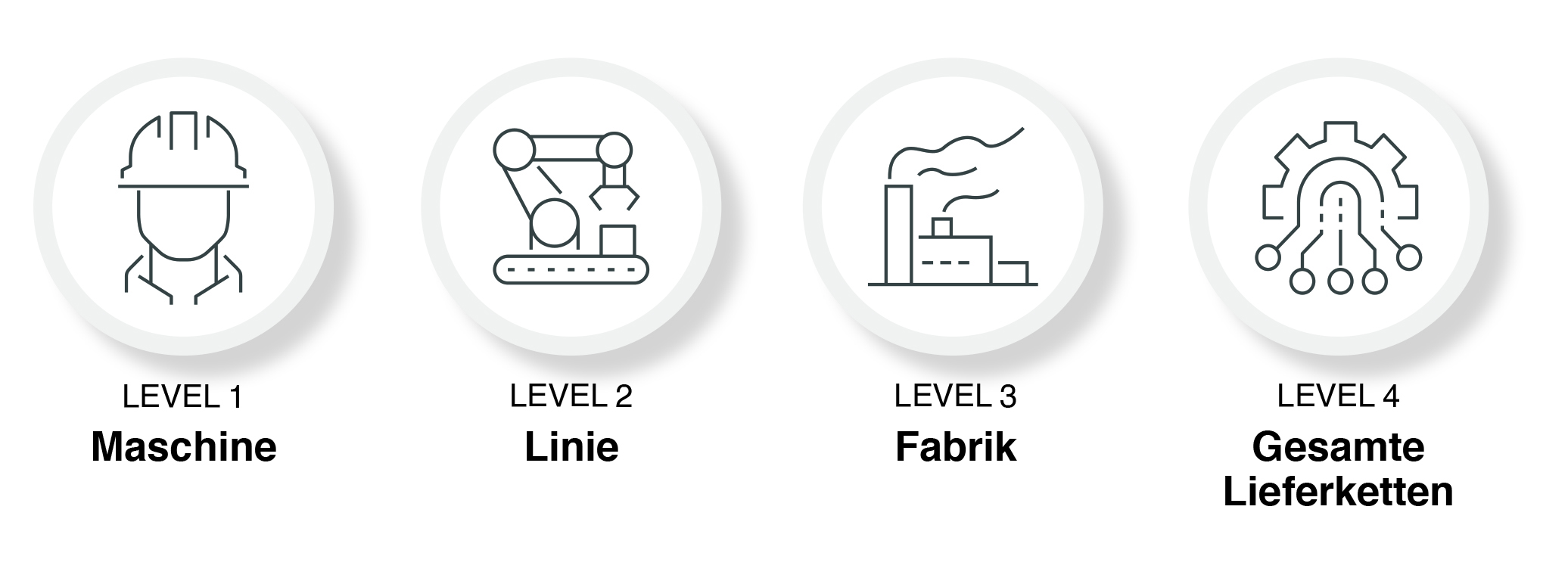 Genau. Auf der einen Seite der Matrix steht der Reifegrad innerhalb der Fabrik, also z.B. ob Daten in der Anlage bislang nur gesammelt werden oder auch schon ausgewertet werden. Konkret handelt es sich um die vier Elemente Datenerfassung, Visualisierung, Analyse und Optimierung. Dem gegenüber steht, in welchem Umfang der Reifegrad bereits umgesetzt wurde: an einer einzelnen Prozessstation, in der kompletten Anlage oder sogar Standort-übergreifend bis hin zur Lieferkette.