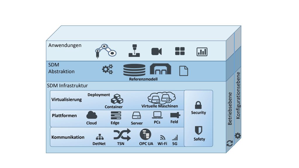 Querschnittsthemen: Flankiert werden die Kernkomponenten der Infrastruktur durch eine große Anzahl an Querschnittsthemen wie Safety und Security. Auch die technologieübergreifende Harmonisierung von Betriebs- und Konfigurationsebene stellt eine der zentralen Herausforderungen des Projekts dar.
