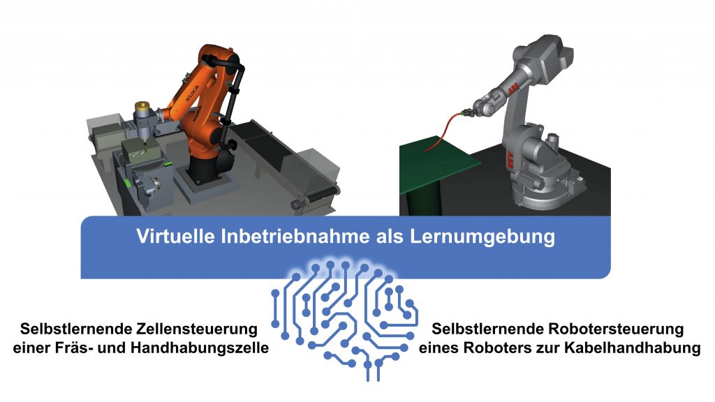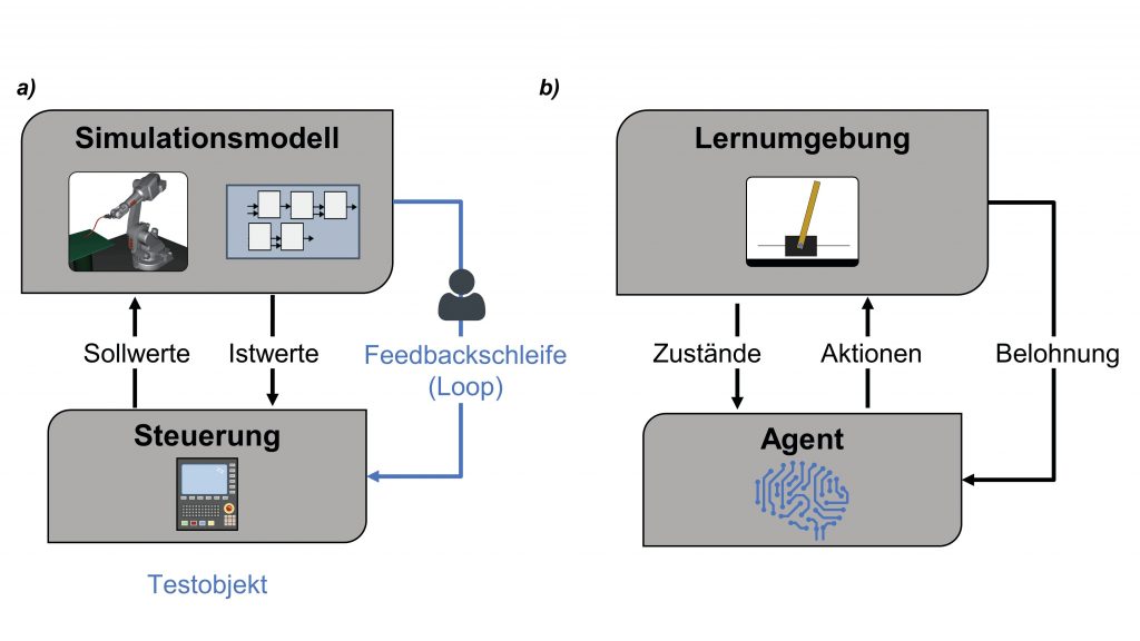 Eine solcher Ansatz zur selbständigen Iteration und Lösungsfindung am X-in-the-Loop-System ist Reinforcement Learning. Dieser Begriff steht für eine Klasse von Problemen, für die eine Vielzahl von Methoden im Bereich des maschinellem Lernens zur Verfügung stehen. Dabei interagiert ein lernfähiges Programm, ein sogenannter Agent mit einer bekannten oder unbekannten Umgebung (engl. Environment). Der Agent sieht die Umgebung über bestimmte Zustandsvariablen und kann über definierte Aktionen Einfluss auf seine Umgebung ausüben. Er lernt dabei laufend dazu und passt sich an, indem er für jede Iteration eine Belohnung oder Bestrafung als numerischem Feedback von der Umgebung erhält. Das Ziel des Agenten ist es die Belohnung auf lange Sicht zu maximieren. Reinforcement Learning hat in vielen, oftmals noch nicht-kommerziellen, Bereichen beeindruckende Ergebnisse erzielt. Bekannte Beispiele sind Videospiele, oder Simulationen von Brettspielen wie Schach oder Go als Lernumgebung, in denen Agenten, über die einfache Maximierung eines Punktestands, auch die fähigsten Menschen weit übertreffen konnten. Entscheidend für Reinforcement Learning ist die Lernumgebung innerhalb derer der Agent interagieren kann. Für Produktionssysteme scheidet das reale System aus, da der Agent während des Lernens unweigerlich Fehler machen muss. Diese Fehler wären kostenintensiv und teilweise gefährlich für das Produktionssystem. Daher müssen simulierte Lernumgebungen geschaffen werden, oder noch besser, bereits bestehende Simulationsumgebungen müssen so erweitert werden, dass sie den Anforderungen des Reinforcement Learning gerecht werden.