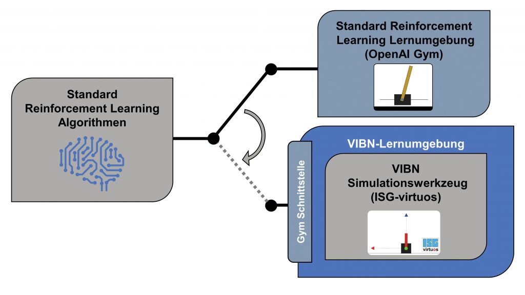 Durch entsprechende Erweiterungen eines VIBN-Simulationswerkzeuges, sodass der OpenAI-Standard eingehalten werden kann, stehen folglich eine Vielzahl von Lernalgorithmen zur Verfügung. Am ISW der Uni Stuttgart wurde eine entsprechende Lösung in Verbindung mit einem VIBN-Simulationswerkzeug entwickelt. Für die Erfüllung des OpenAI-Standards waren dabei bestimmte Funktionen des Werkzeugs gegeben. Es muss eine Schnittstelle für den Austausch von Signalen, zwischen dem Agenten und der Simulation bestehen. Üblicherweise existieren bei VIBN-Simulationswerkzeugen dazu Schnittstellen auf Feldbusebene, um denselben Kommunikationsweg wie am realen System zu realisieren. Für eine VIBN-Lernumgebung müssen jedoch weitere relevante Funktionen wie das Starten, Stoppen und Resetten von Simulationen sowie das Parametrieren von Simulationsmodellen realisiert werden. Daher wurde auf Basis einer Remote-Schnittstelle des VIBN-Simulationswerkzeuges eine spezielle Kommunikationsschnittstelle entwickelt, welche den OpenAI-Standards entspricht. Die entwickelte VIBN-Lernumgebung wurde bisher für einfache Logiksteuerungen (Zellensteuerung) und Bewegungssteuerungen (Motion) für Robotersysteme getestet.