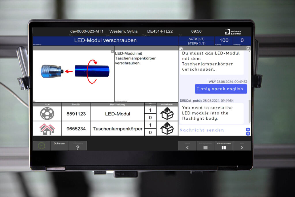 Effizienz bedeutet, Zeit und Kraft optimal zu nutzen. In der Produktion wird Zeit aber noch oft durch Abwarten und Fehlerbehebung verschwendet. Deshalb ist es entscheidend, dass der Mitarbeiter genau die Information, das Wissen und die Befähigung erhält, um effizient arbeiten zu können. „Digitale Arbeitsplatzlösungen bieten den Vorteil, Informationen in der richtigen Form sowie zur richtigen Zeit korrekt bereitzustellen“, sagt Friedrich Steininger, Managing Director von DE Software & Control, die HMC-Lösungen auf Basis von LLMs und KI für den industriellen Shopfloor entwickelt. „Dies ermöglicht eine präzisere und kontextgerechtere Darstellung von Arbeitsanweisungen, die in Echtzeit generiert und angepasst werden können.“