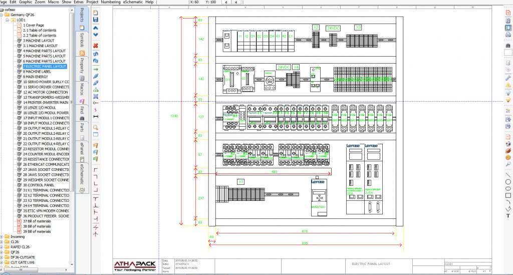 Sobald die Steuerung vervollständigt wurde, werden die Bezeichnungen normalisiert und Steuerzeichen zugewiesen. Sie ermöglichen eine flexible Berichterstellung und Dokumentation (z.B. Klemmenpläne, Kabelpläne, Anschlußpläne, Stücklisten, Gerätelisten oder Bestelllisten) einschließlich Kundendokumentation, Beschriftung und Ausdruck. Hier beginnen die Übersetzungsprogramme, einschließlich der Konvertierung in Fremdsprachen und kundenspezifischer Änderungen. Alle Import- bzw. Exportvorgänge werden von Cofaso über die XML-Schnittstelle ausgeführt, um einen möglichst hohen Automatisierungsgrad zu gewährleisten. Eine vierte Informationsebene ermöglicht es dem Anwender Athapack, auch Grafikdateien in der Software zu verarbeiten. Dabei handelt es sich um verschiedene Maschinenlayouts, die CAD-Systeme für die mechanische Konstruktion in Form von DWG-Dateien bereitstellen. Diese Layouts werden hinsichtlich der elektrotechnischen Anforderungen analysiert, bevor sie als freie Grafikseiten kopiert werden. Im ECAD-Tool können die Position und Bezeichnung der Komponente direkt eingefügt und anschließend die komplette Grafik in die Projektdokumentation eingebunden werden.