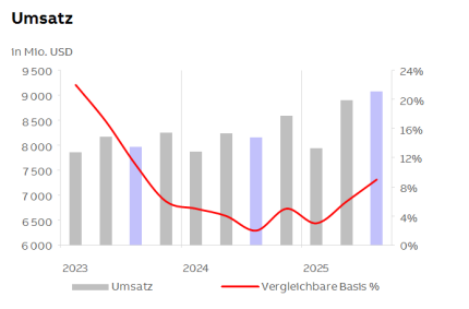 Der Auftragseingang in der Elektrifizierungsinfrastruktur und Automatisierung stieg bei ABB im dritten Quartal gegenüber dem Vorjahresquartal um 12% auf 9.143Mio.$US, getrieben durch die positive Entwicklung in allen vier Geschäftsbereichen. Auf dem amerikanischen Kontinent erhöhten sich die Aufträge um 19%. In Europa wuchs der Auftragseingang um 16%. Die Region Asien, Naher Osten und Afrika verzeichnete ein Auftragsminus von 1%, einschließlich eines Rückgangs um 3% in China. Bei sehr guter Marktstimmung legte der Auftragseingang bei Rechenzentren zweistellig zu. Im Robotikgeschäft wurde die Schwäche in den Segmenten Automobilindustrie und allgemeine Industrie durch die positive Entwicklung in Bereichen wie der Unterhaltungselektronik und Logistik kompensiert. Im Maschinenbausegment stieg der Auftragseingang von einem niedrigen Vergleichswert ausgehend deutlich an. In einem anhaltend herausfordernden Markt blieb das absolute Niveau jedoch gedämpft. Der Umsatz verbesserte sich in allen Geschäftsbereichen und stieg um 11% auf 9.083Mio.$US. Unterstützt wurde dies durch die Abwicklung des Auftragsbestands und die positive Entwicklung im kurzzyklischen Geschäft und im Servicegeschäft. Höhere Volumen waren der Haupttreiber für das Umsatzwachstum, unterstützt durch eine gewisse positive Preisentwicklung.