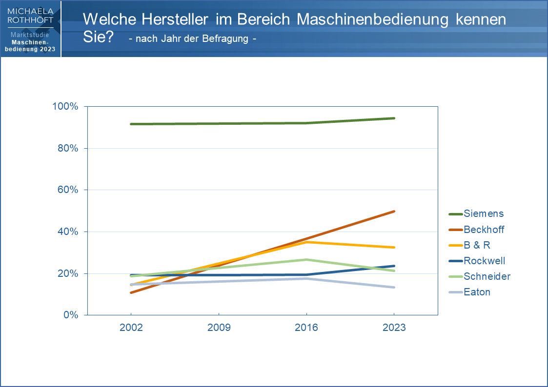 Im Rahmen der Wiederholung einer Studie aus dem Jahr 2016 gaben im Januar/Februar 2023 deutschlandweit 394 Maschinenbauer Auskunft über Kaufverhalten, technische Anforderungen und zukünftige Entwicklungen im Bereich Maschinenbedienung. Neben der Industrial Security werden aber auch weitere Funktionen, wie die Webfunktionalität, eine Anbindung an Tablets/Smartphones oder eine integrierte Edge-Funktionalität zukünftig deutlich stärker nachgefragt. Eine andere moderne Technologie, die gesten basierte Bedienung, ist aber derzeit bei nicht einmal jedem 20. Maschinenbauer zu finden. Ein wachsender Trend besteht in der drahtlosen Anbindung der Maschinenbedienung, die demnächst doppelt so häufig in Unternehmen verbreitet sein wird. In diesen Zusammenhang passt auch, dass der Einsatz mobiler Bedienterminals seit 2016 gestiegen ist. Es gibt eine beträchtliche Zahl von Anbietern auf dem deutschen Markt: Allein in dieser Studie wurden über 160 Hersteller im Bereich Maschinenbedienung genannt. Mit weitem Abstand am bekanntesten ist dabei die Firma Siemens, die mehr als 9 von 10 Teilnehmern (94%) einfällt. Den nächsten Platz belegt Beckhoff mit 50%, wobei der Wert seit 2016 (37%) gestiegen ist. Die Dominanz von Siemens zeigt sich am deutlichsten daran, dass 57% diesen Hersteller als Hauptlieferanten angegeben haben, was auch durch die wichtige Rolle der Kundenvorschrift bei der Kaufentscheidung begründet wird. Es gibt aber auch Branchen, wie den Papier-/Druckmaschinenbau, bei dem die Kundenvorgabe eine deutlich geringere Bedeutung hat.
