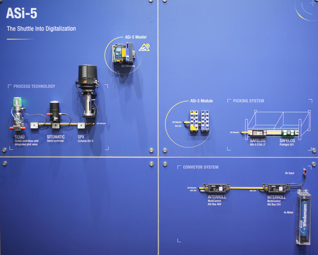 Bihl+Wiedemann präsentierte auf der SPS 2023 im Rahmen einer Multi-Vendor-Wand ASi-5-Produkte von verschiedenen Herstellern für unterschiedliche Branchen und Anwendungsfälle in einer einzigen Applikation. Alle Geräte sind über ein einziges ASi-Profilkabel an ein ASi-5/ASi-3 Feldbus Gateway mit integriertem Sicherheitsmonitor, OPC UA und Webserver angeschlossen. Gezeigt werden Lösungen von Gemü, Sitomatic und SPX für die Prozesstechnik, von Safelog für Picking Systeme und von Interroll für die Fördertechnik. Die verwendeten Produkte sind alle bereits in den Software-Suites des Unternehmens, ASimon360 und Asi-Control-Tools360, integriert und können damit zusammen mit den ASi-5-Produkten eingesetzt werden.