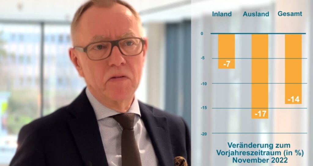 In den Schlussmonaten des Jahres 2022 haben sich die vielfältigen konjunkturellen Dämpfer auch in den Auftragsbüchern des Maschinen- und Anlagenbaus niedergeschlagen. Nach einem zweistelligen Bestellminus im Oktober blieben die Bestellungen auch im November um real 14% unter ihrem Vorjahreswert. Dabei verfehlten die Inlandsbestellungen ihr Vorjahresniveau um 7%, die Aufträge aus dem Ausland sanken um 17%. Der Rückgang war im Euroraum (-30%) deutlich höher als in den Nicht-Euroländern (-11%). „Zum Teil ist der Rückgang mit einem sogenannten Basiseffekt erklärbar. Im November 2021 gab es mehr Aufträge für Großanlagen, und das Vorjahresniveau lag ohnehin recht hoch“, erläutert VDMA-Chefvolkswirt Dr. Ralph Wiechers. „Doch das Minus lässt sich damit nicht komplett wegdefinieren. Gut ist, dass viele Maschinenbaufirmen über Auftragspolster verfügen, die sie auch ins neue Jahr tragen“, fügt er hinzu. Im weniger schwankungsanfälligen Drei-Monats-Zeitraum September bis November 2022 gingen die Bestellungen um insgesamt 9% im Vergleich zum Vorjahr zurück. Aus dem Inland kamen 9% weniger Bestellungen, die Auslandsaufträge sanken ebenfalls um 9%, wobei die Euroländer um 18% unter dem Vorjahr lagen und die Nicht-Euroländer 6% weniger bestellten.