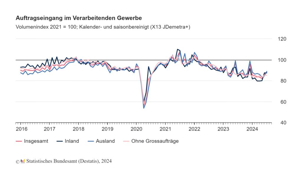 Der reale (preisbereinigte) Auftragseingang im Verarbeitenden Gewerbe ist nach vorläufigen Angaben des Statistischen Bundesamtes im Juli gegenüber Juni saison- und kalenderbereinigt um 2,9% gestiegen. Im weniger volatilen Dreimonatsvergleich lag der Auftragseingang von Mai bis Juli um 1,7% höher als in den drei Monaten zuvor. Ohne die Berücksichtigung der Großaufträge war der Auftragseingang im Juli um 0,4% niedriger als im Juni und von Mai bis Juli um 1% höher als in den drei Monaten zuvor. Für Juni ergab sich nach Revision der vorläufigen Ergebnisse einen Anstieg des Auftragseingangs von 4,6% gegenüber Mai (vorläufiger Wert: +3,9%).