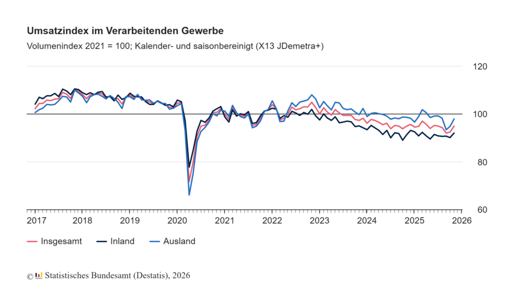 Der reale Umsatz im Verarbeitenden Gewerbe war nach vorläufigen Angaben im November 2025 saison- und kalenderbereinigt 2,7% höher als im Vormonat. Im Vergleich zum Vorjahresmonat November 2024 war der Umsatz kalenderbereinigt 0,1% höher. Für Oktober 2025 ergab sich nach Revision der vorläufigen Ergebnisse ein Anstieg von 0,4% gegenüber September 2025 (vorläufiges Ergebnis: +0,3%).
