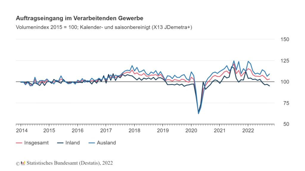 Der Auftragseingang im verarbeitenden Gewerbe ist nach vorläufigen Angaben des Statistischen Bundesamtes im Oktober gegenüber September saison- und kalenderbereinigt um 0,8% gestiegen. Ohne die Berücksichtigung von Großaufträgen ergab sich jedoch ein Rückgang von 1,2%. Im Vergleich zum Vorjahresmonat Oktober 2021 lag der Auftragseingang im diesjährigen Oktober kalenderbereinigt 3,2% niedriger. Für September 2022 ergab sich nach Revision der vorläufigen Ergebnisse ein Rückgang des Auftragseingangs gegenüber August 2022 von 2,9% (vorläufiger Wert: -4%). Während sich die Aufträge aus dem Inland im Oktober im Vergleich zum Vormonat um 1,9% verringerten, stiegen die Auslandsaufträge um 2,5%. Dabei erhöhten sich die Auftragseingänge aus der Eurozone um 2,6% und die Auftragseingänge aus dem restlichen Ausland um 2,5%.